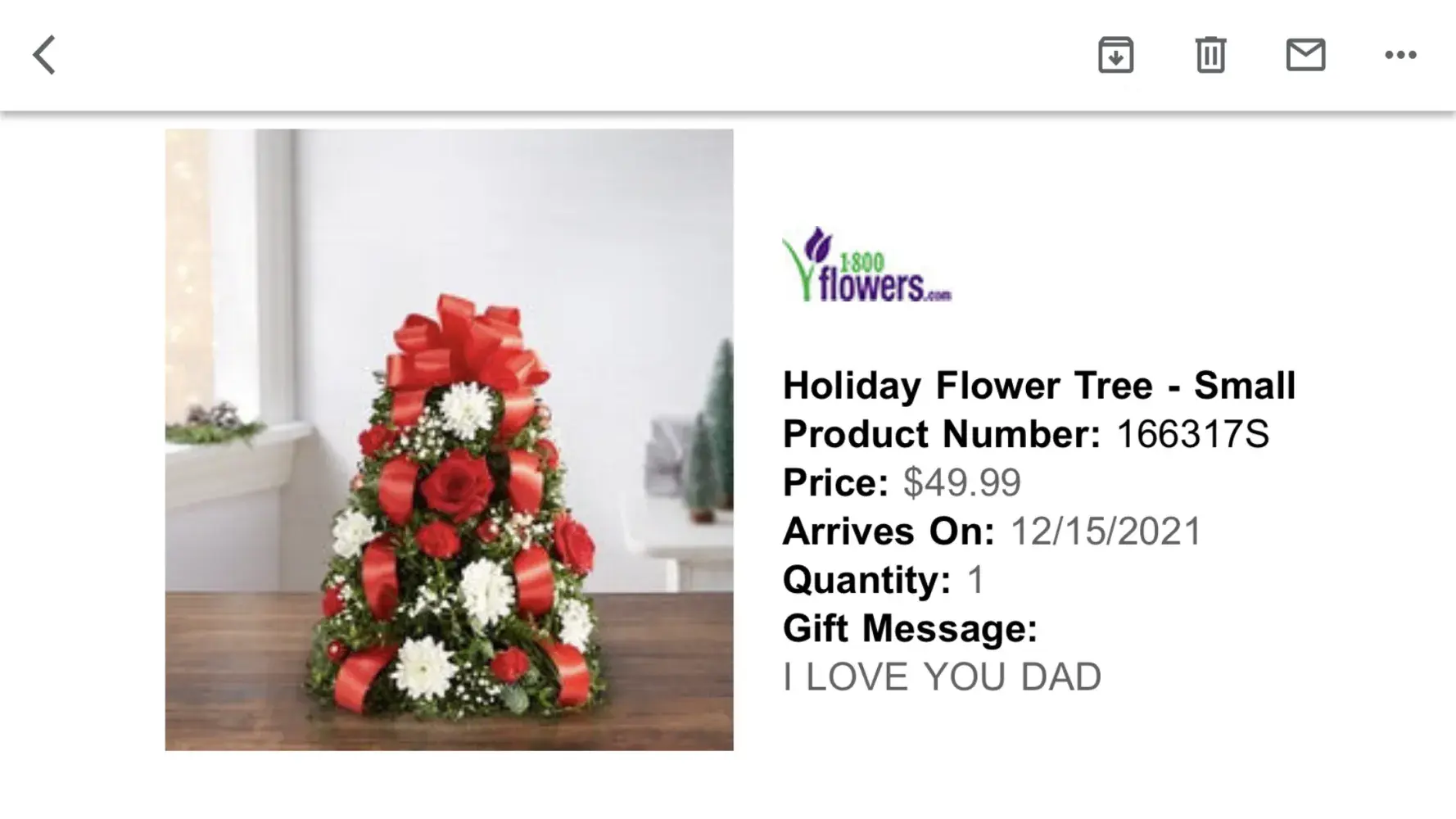 Ordered a Christmas tree arrangement for my father, whom is a Marine Veteran and 100% disabled & bed bound.