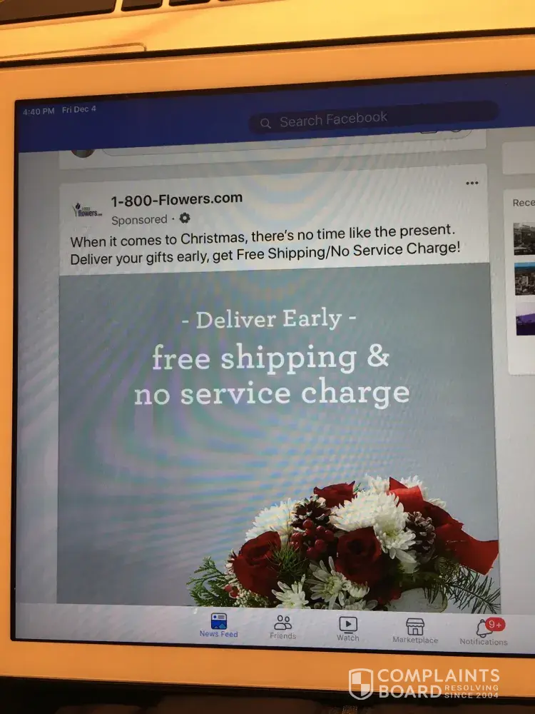 I ordered flowers from their FB ad that said Free service charge if I ordered sooner rather than later for Xmas delivery. I clicked on and choose a Holiday centerpiece. I filled out the order and wrote in all pertinent info. The process was continuing along to the point where I would put in c card info and then review order before it went through. Well, it went through without my reviewing it. I went to my email and there was the order with the $14.99 service charge. I called them and they told me they would refund the $14.99. I am not sure if they will. I will dispute the charge if necessary with Visa. I took a pic of FB ad... good thing cause I couldn't find it after the fact.