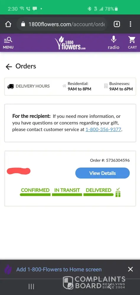 Ordered flowers for next day delivery. Three days later I look online, and the order is still in the "confirmed" state not even in transit. I do the live chat and the person on the other end send she can send them again for a fee. AGAIN, they were never sent to begin with. I could not get through to them. I told them to cancel the order, I was not paying for anything twice. I hung up and called an agent and told her to cancel the order. Two more days after the cancellation I look online and the order is still in the "confirmed" state not cancelled or delivered. I call again and the person who answered the phone I could not hear due to the screaming children in the background. I asked him to please close the door so I could hear what he was saying. After another 2 minutes and getting upset he closed the door and blocked the children's screaming. This customer service man told me they were delivered today. He could not tell me why they were not sent when they were scheduled nor why they did not call or email me to that effect and also why the past two agents did not cancel my order. Received the original confirmation email and that is it. After 37 minute on the phone no answers, no way to file a complaint, no resolution, the agent said he was putting me on hold to find a way to contact someone, I was hung up on.