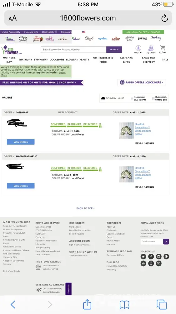 On april 10 I placed an order for an all white sympathy arrangement I paid $131.40. First off my order was never received that day even though it showed as delivered. I waited over an hour and a half on the phone to speak with customer service I got Tired of waiting because I have two young daughters I have to take care of and so I sent an email. They responded with apology and and said they would send out a replacement arrangement on monday so I waited patiently and I am so angry at what my friend received. I order all white flowers and my friend received a colorful arrangement which is not worth the money I spent. The company is garbage.