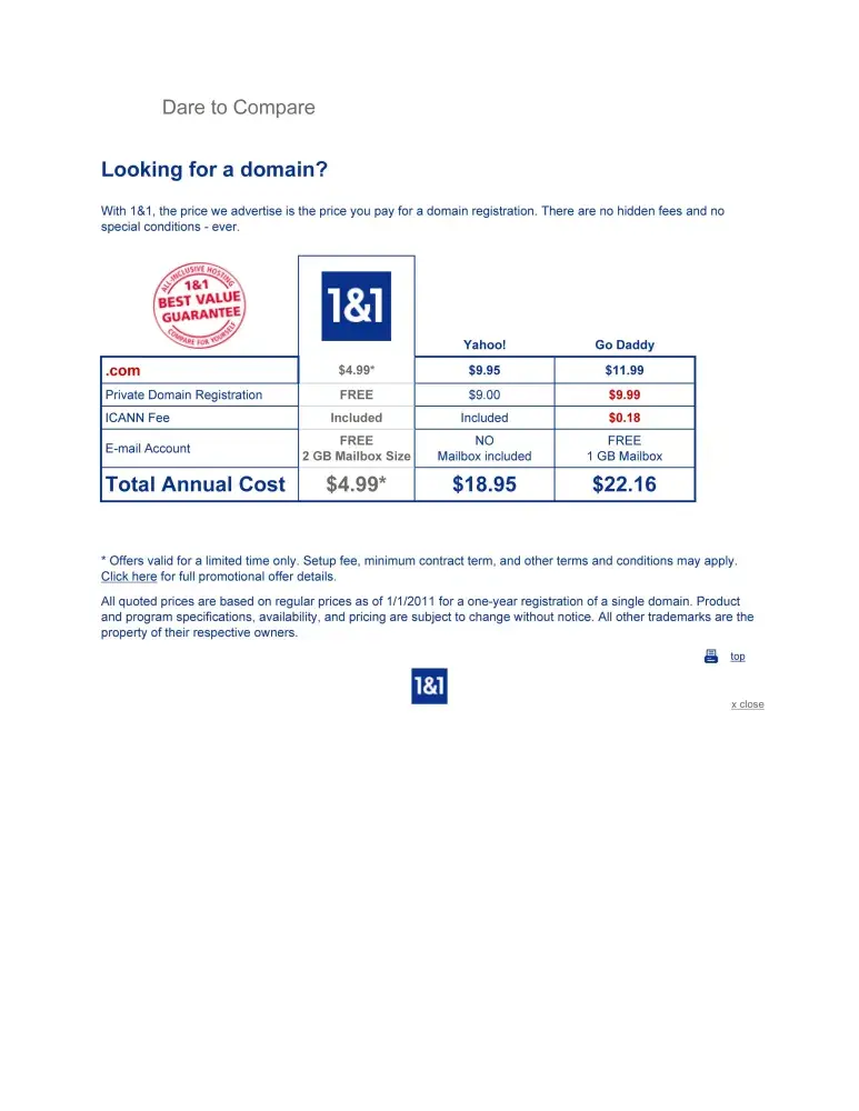 1AND1.COM This is a fraudulent company and unformed. Not accredited by BBB (Better Business Bureau). Keep and not to delete your personal information and credit card. Billing is days after order with higher values than those agreed. Your domain can go in redemption period and finally you can lose your domains.