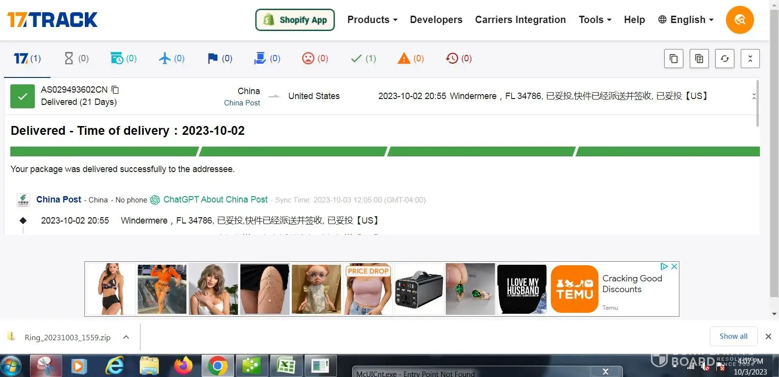 I have a list of movement of order by 17Track. They also say that it was delivered on10-3-2023. It was not. I have contacted customer service for item, they just want me to wait. I contacted local delivery companies and post office no one knows anything. No one will tell me the delivery company that is supposed to deliver my order. Do you need more information?