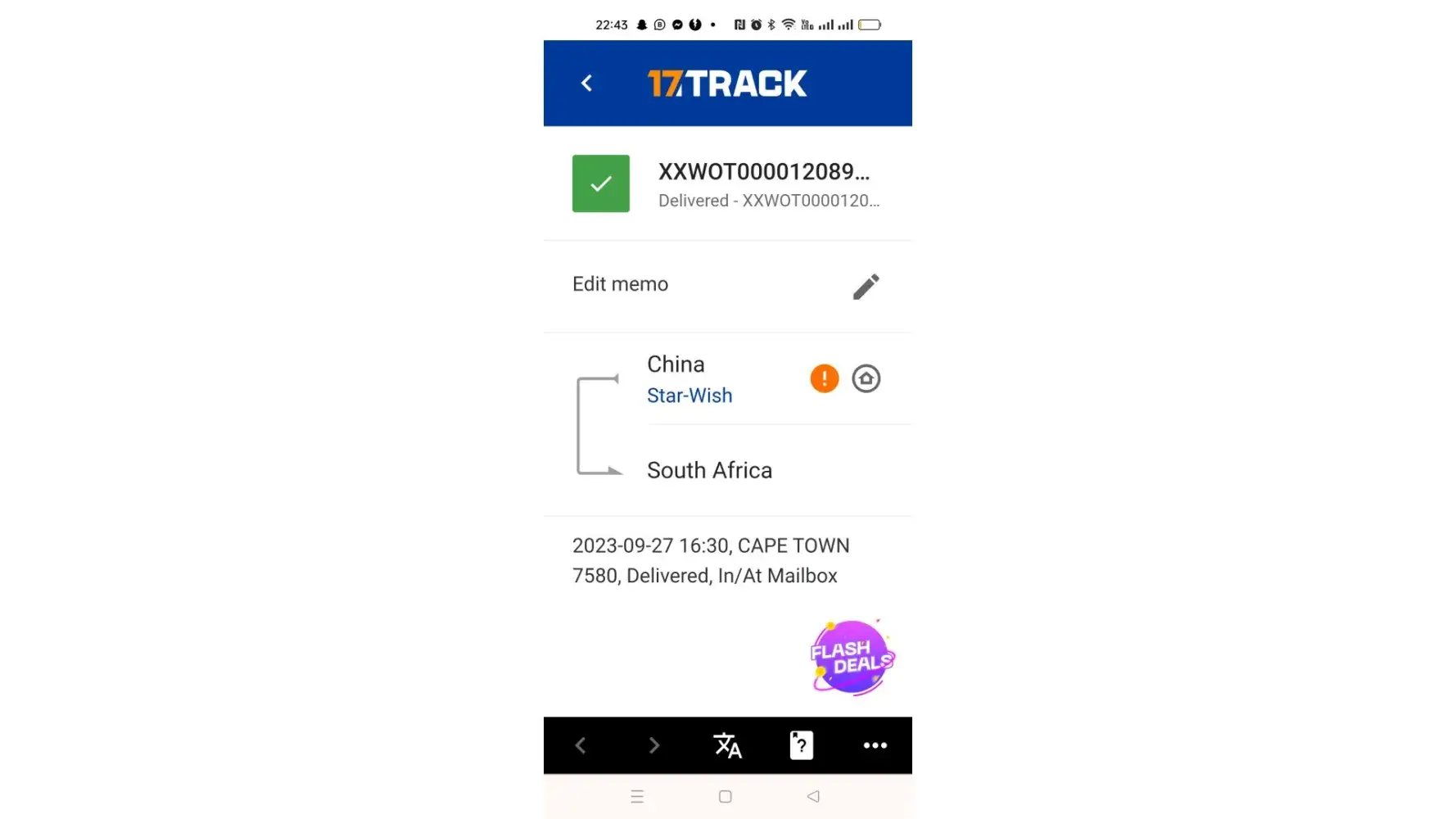 My tracking number is XXWOT0000120894YQ and is showing that it's been delivered on the 27 of September 2023
