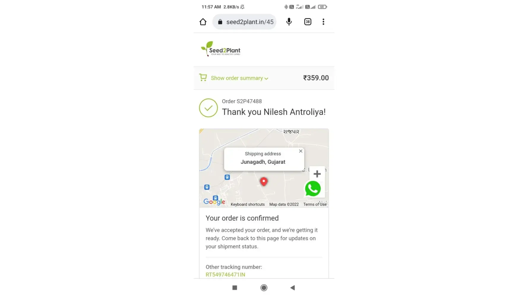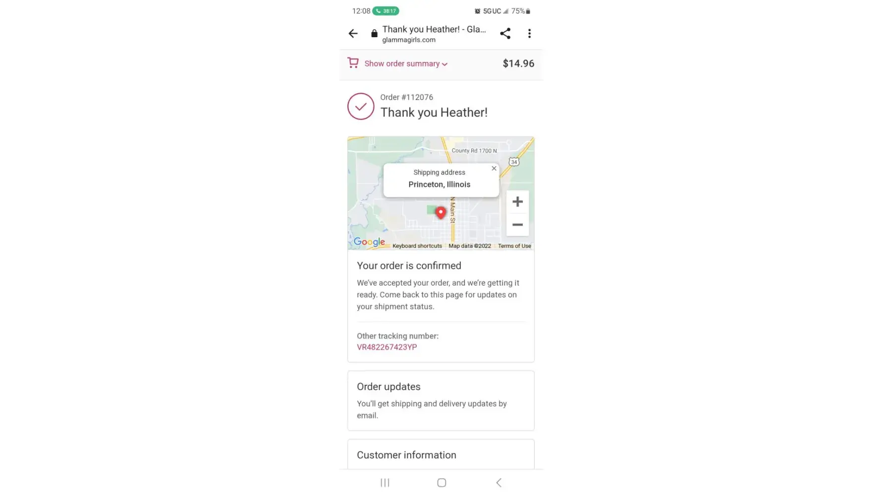 The tracking number is VR482267423YP