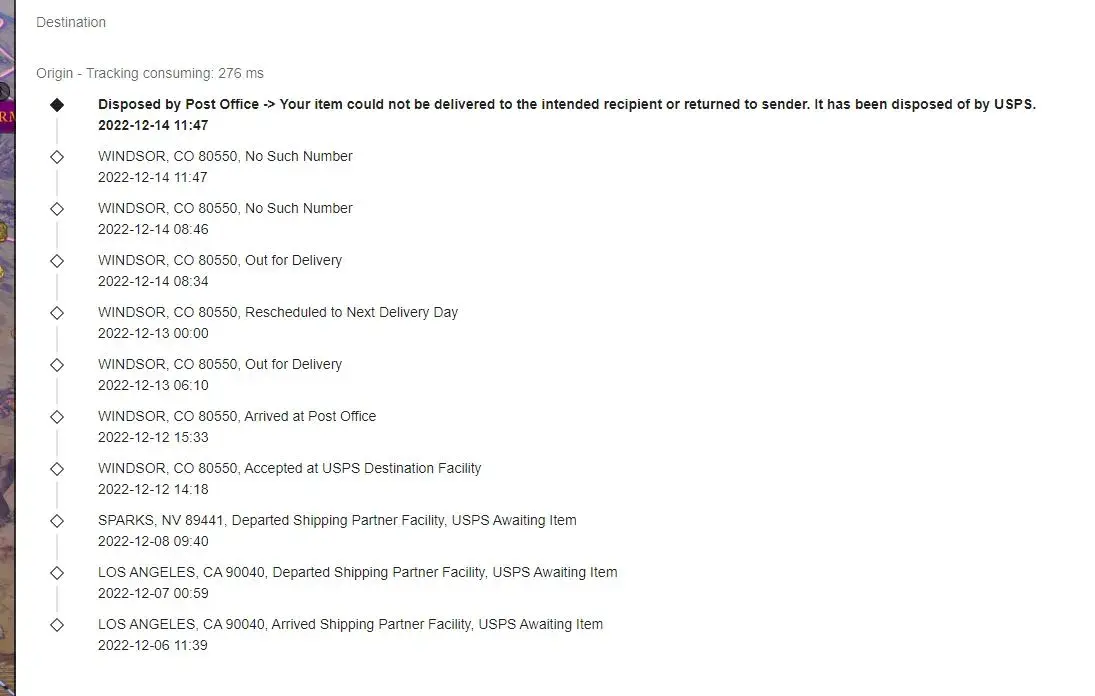 12/14/22 tracking details listed below indicates USPS destroyed an ordered package. USPS DOES not randomly destroy mail.
