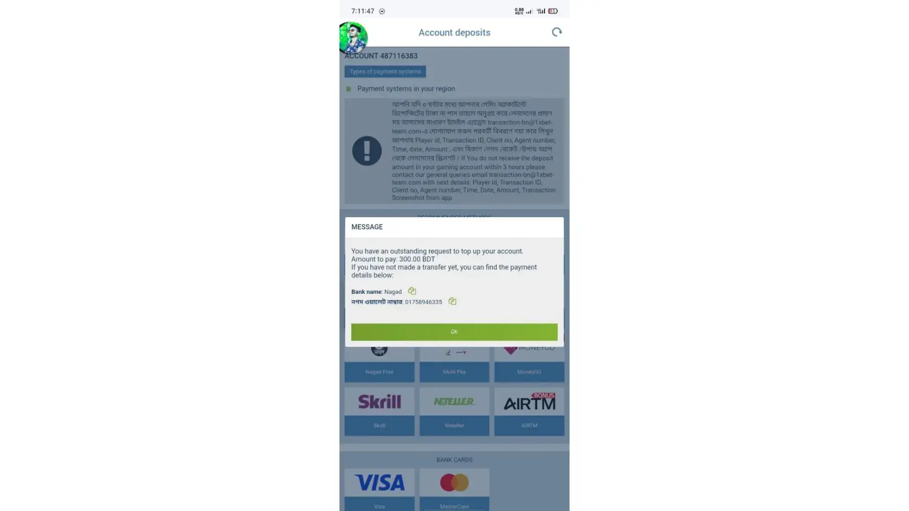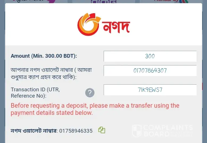 Sir i have diposit problem.18 hours gone but they are Don't solve my problem .i was try to diposit by fast Nagad 500/ taka (Bangladeshi currency). Diposit was successful but i didn’t get money yet In my 1x bet account. I was send email as per 1x bet law. But they are want video proof . that's why I also was send it by email. But they are Don't solve my problem yet. After 3 hours they are send email and they are Write don’t came any information from technical department. AGAIN we are froward your information in our technical Department . You want know update contact our gmail address.