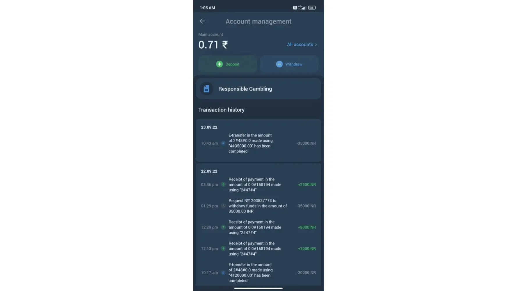 I had made a withdrawal request of ₹35000 on 22/09 .On 23/09 they showed successful on 1x app but not credited to my account