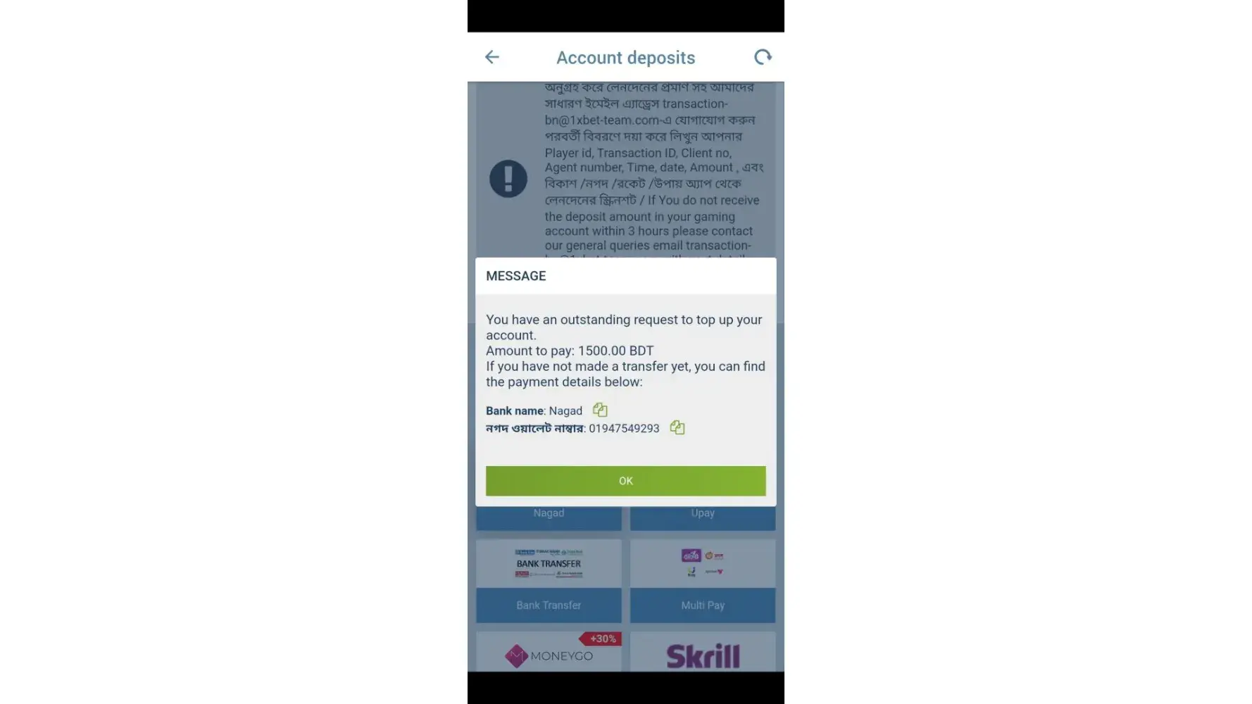 Sir I deposited money in mu 1xbet account through bank transfer. But I didn’t recived my full amount that I deposited please send me my remaining deposited money to my 1xbet account.