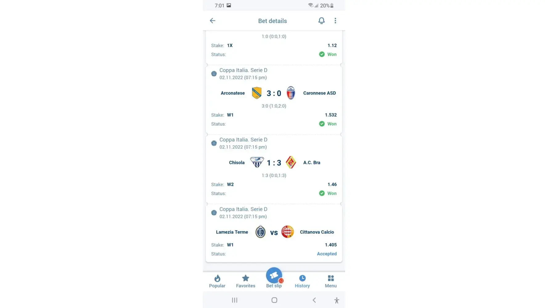 Dear sir the match of COPPA ITALIA SERIE D of 2nd of November 2022 ,starts at 7.15p.m between LAMEZIA TERME VS CITANOVO CALCIO result is still pending in urs site ,I attached the bet slip also please look after this matter its became 2 days I m complain about this matter u urs authority but...