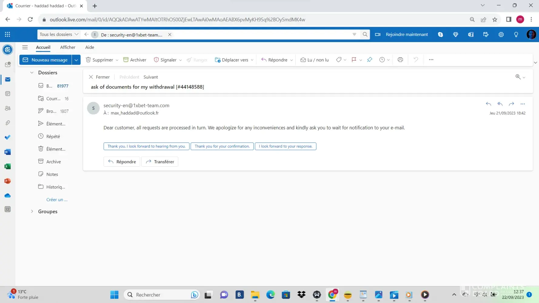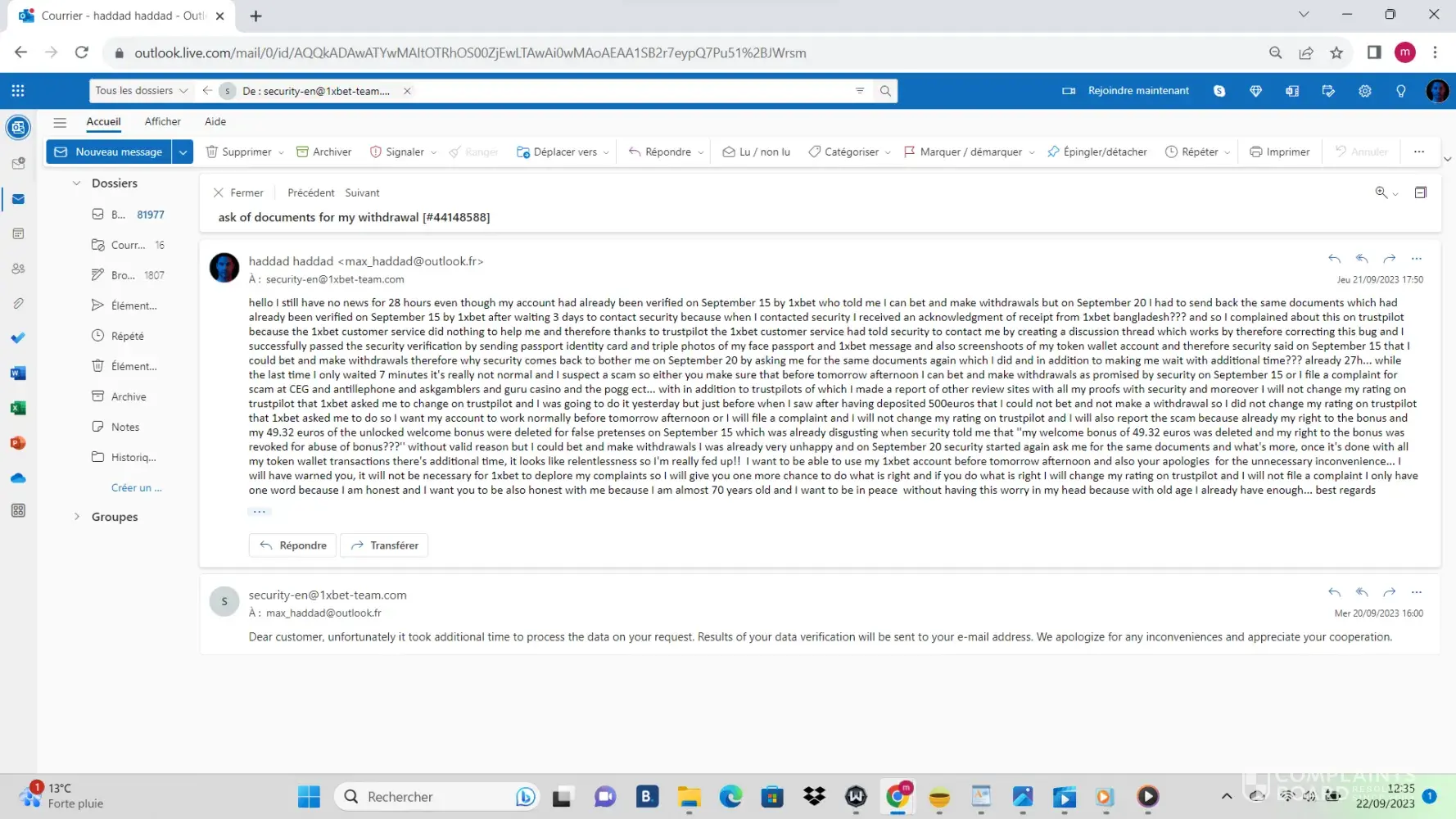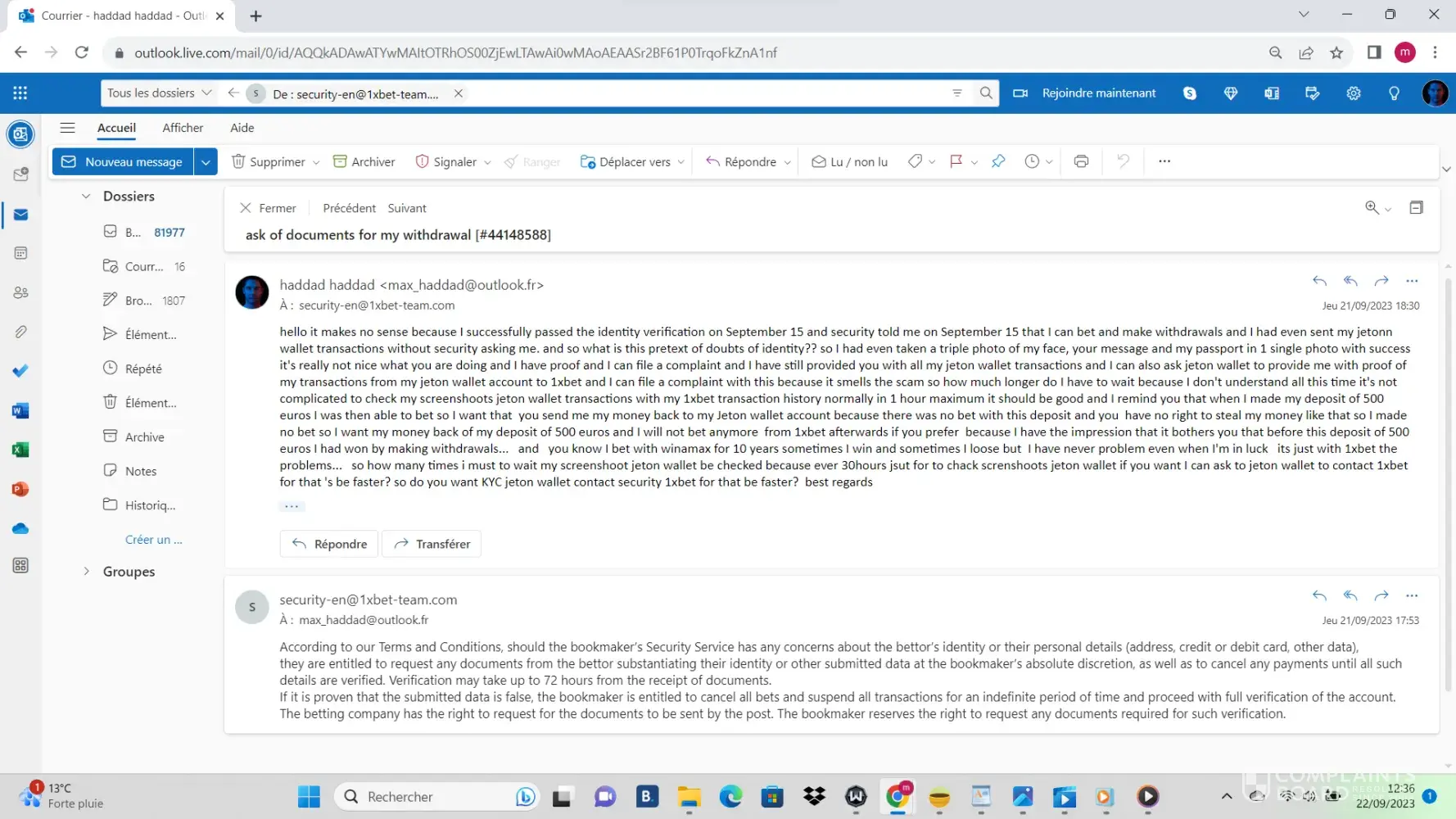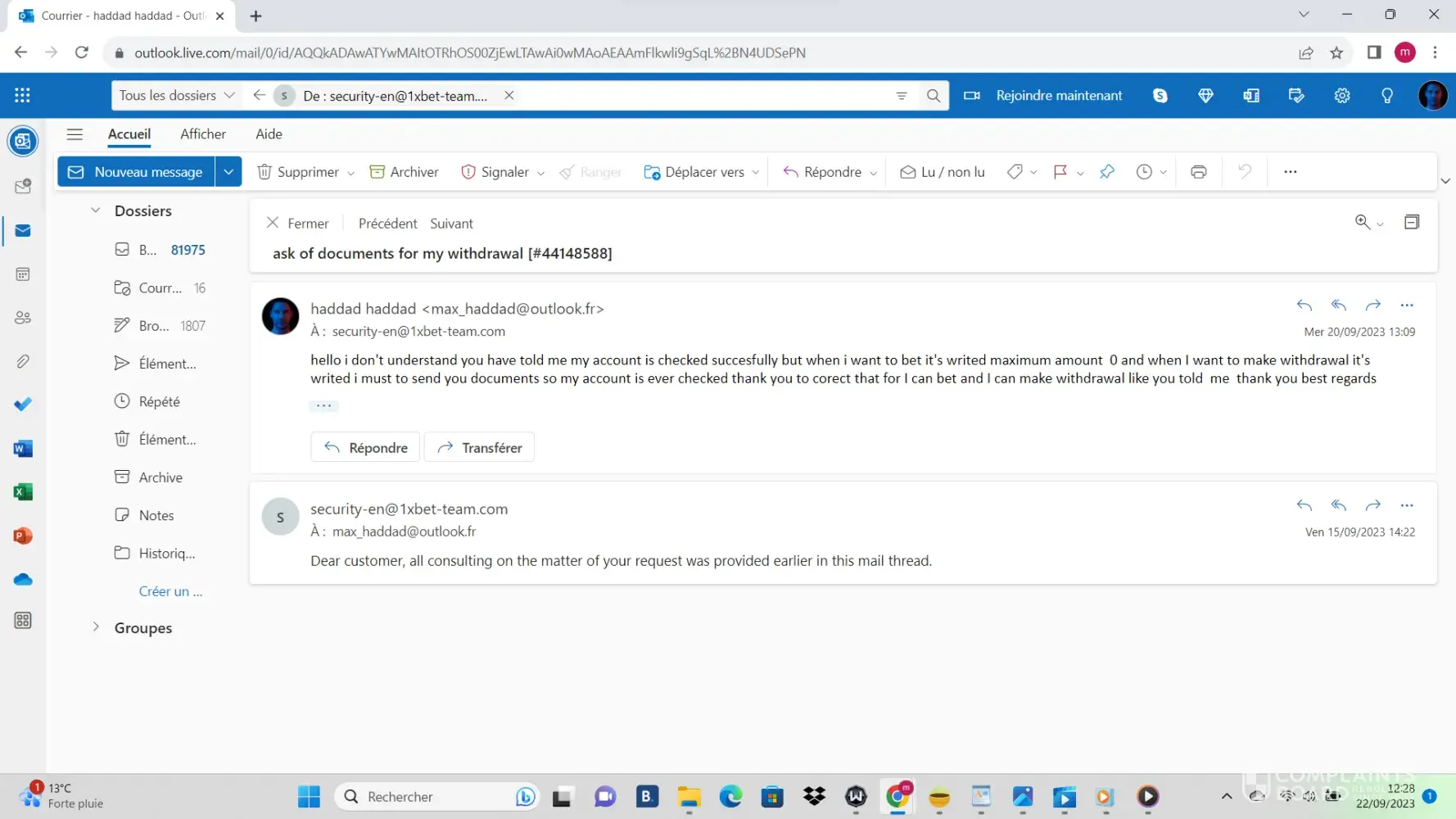 hello no answer from public realation 1xbet for 7 days ago for my problem of can no more on my account 1xbet my 1xbet account number [protected] if that can help I want to can bet and my bonus of 49.32 euros unlocked confiscated unfairly come back on my balance and my right to have bonus cdly