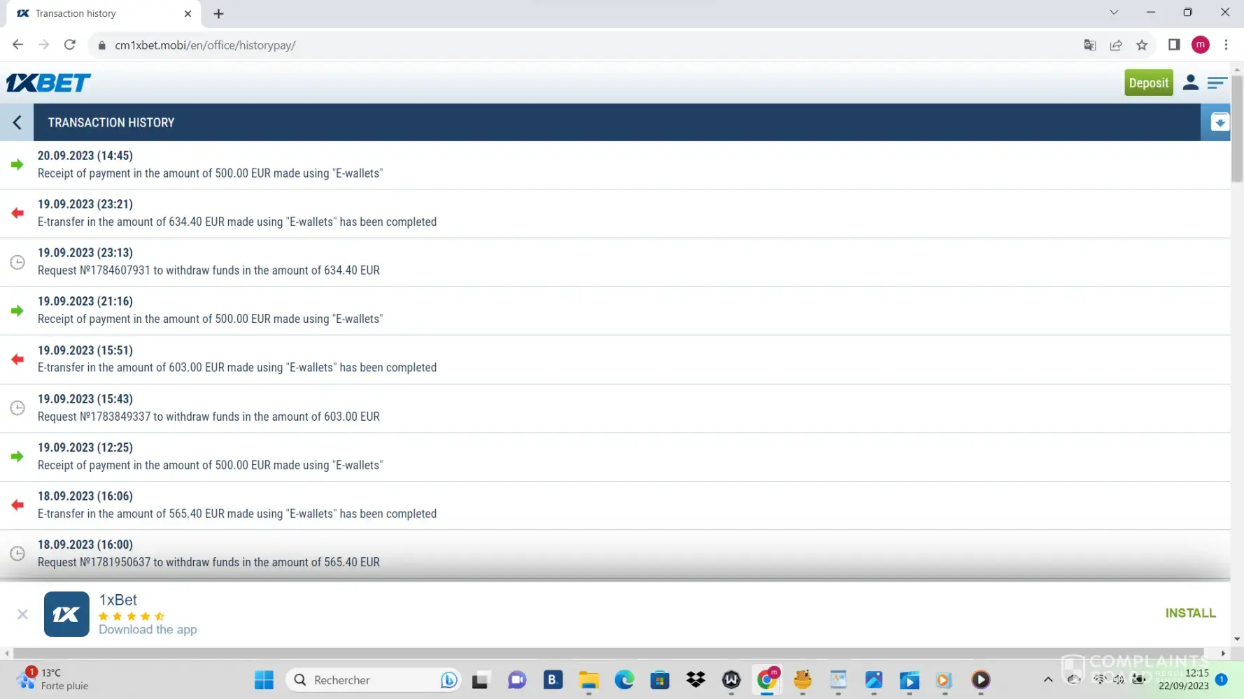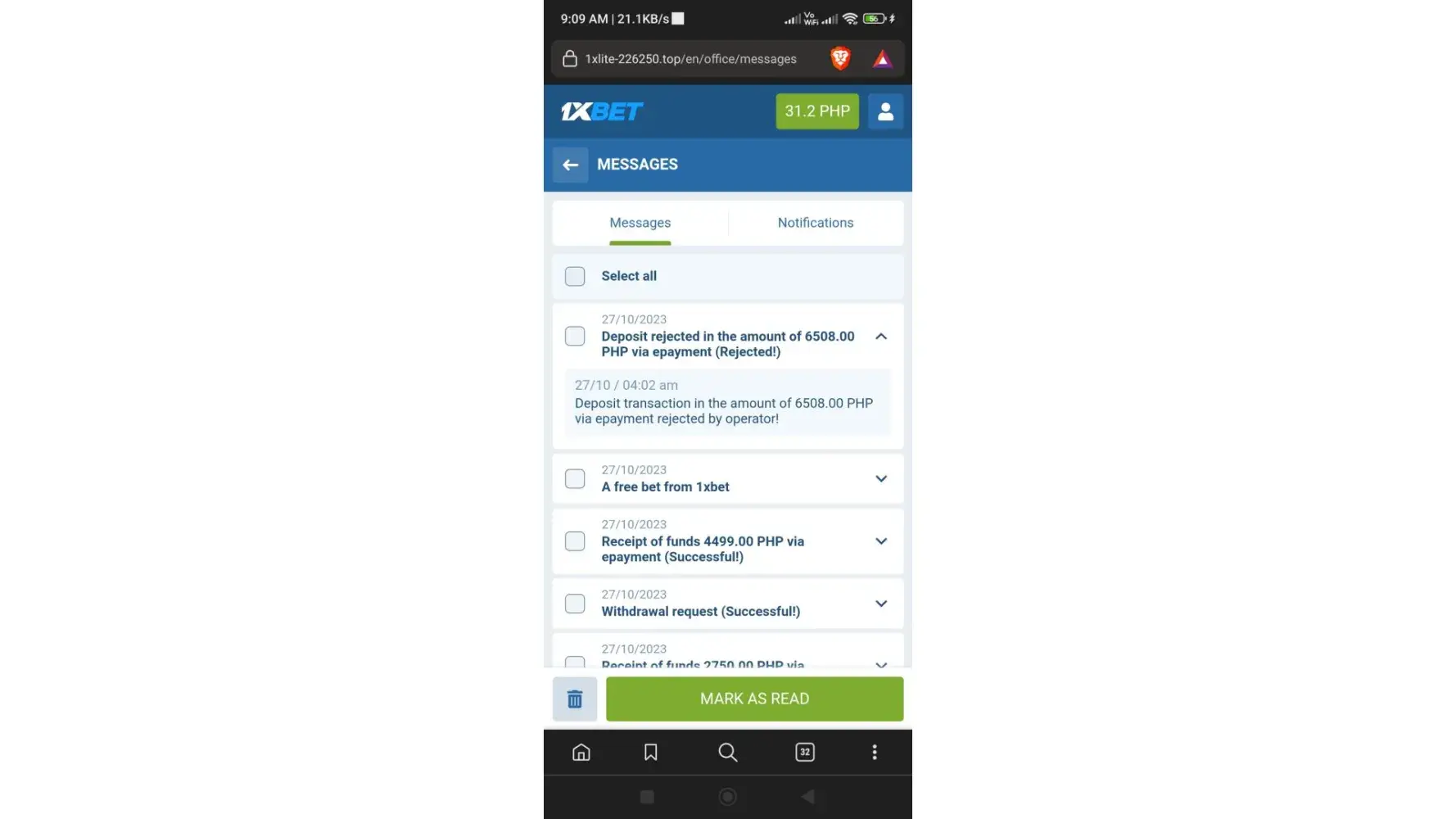 I send the amount of 1000 and then 200 to 1xbet it was rejected but deducted from my account