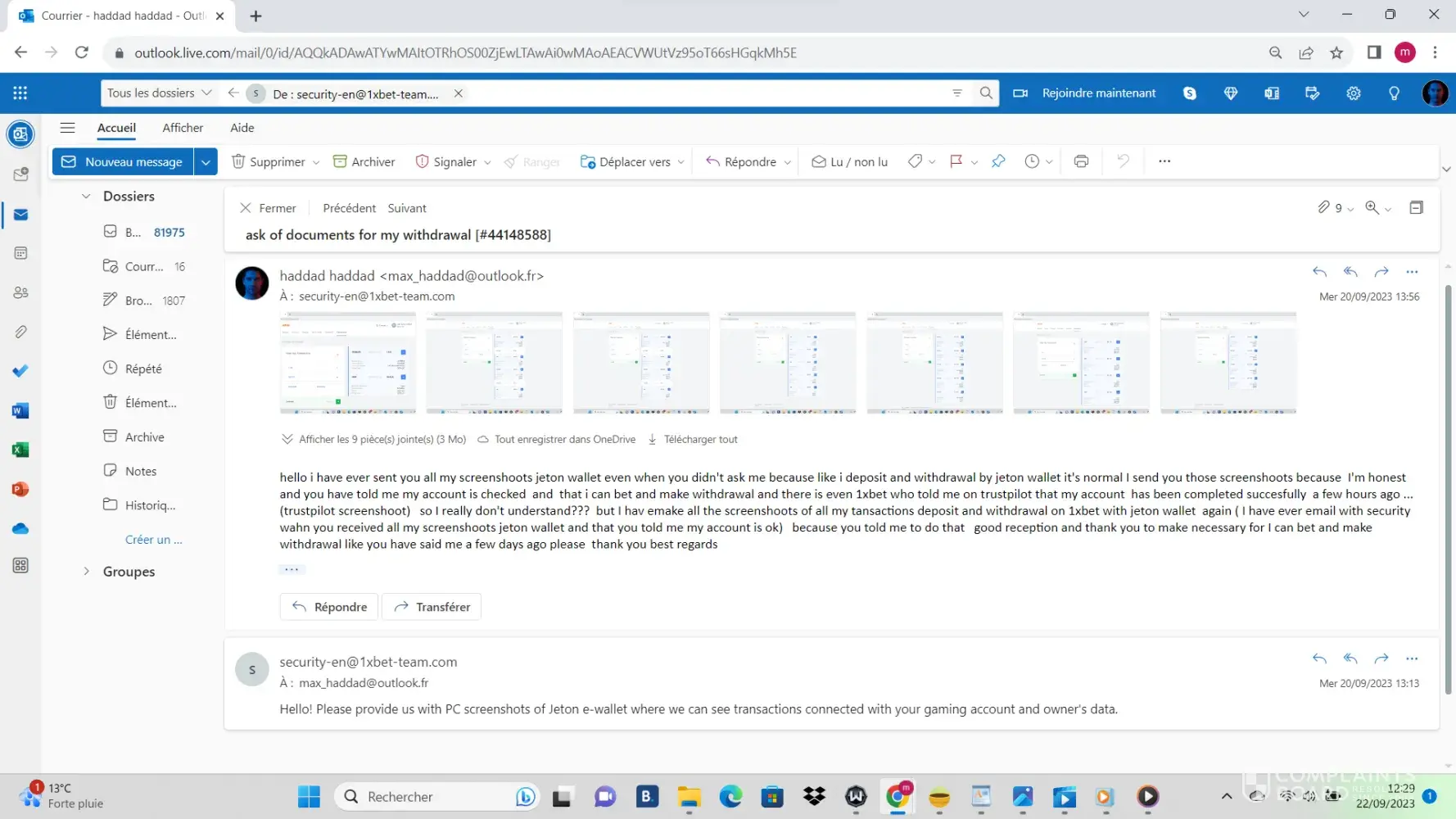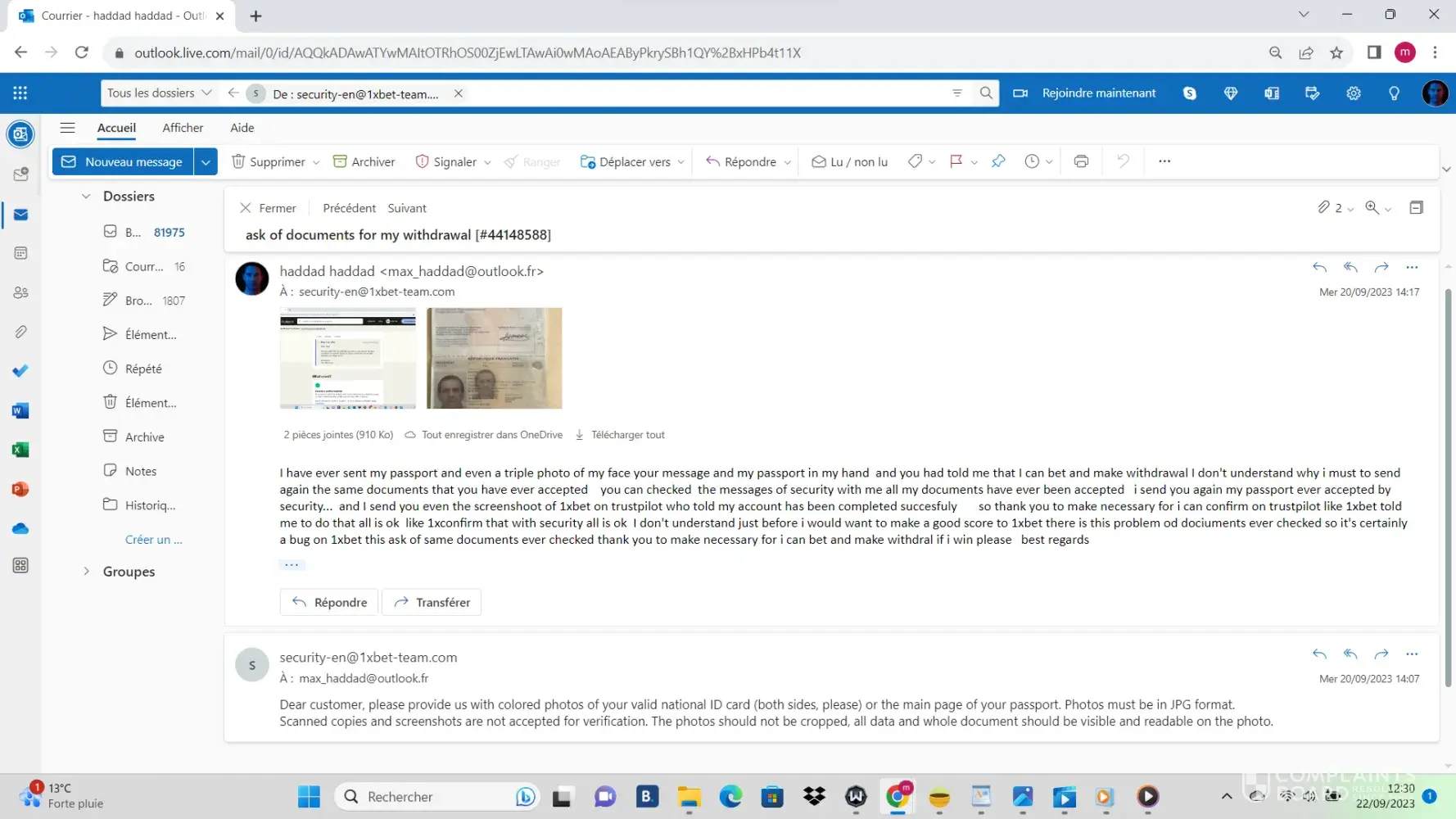 Before that, 1xbet had already required a series of documents, all of which were delivered. (Photo of the identity card, photo of the holder holding the identity card and photo of the holder holding an ID card next to the email conversation on the computer). All this process only occurred after a withdrawal attempt. Long time. I wait for your help.