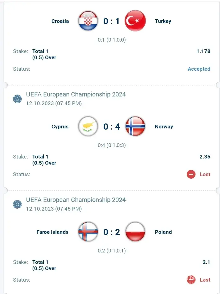 Cyprus vs Norway (booked Over 0.5) and they scored 4 goals