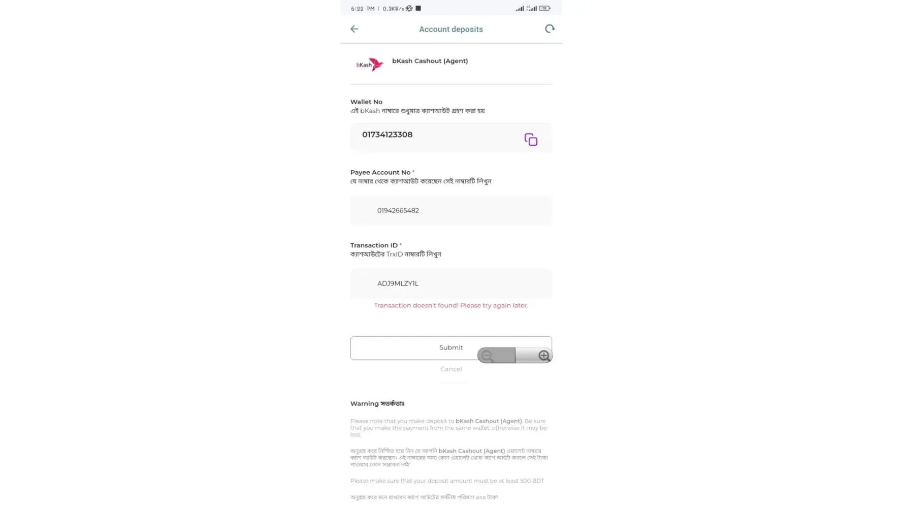 I deposit ₱500 but it doesn't go in my account