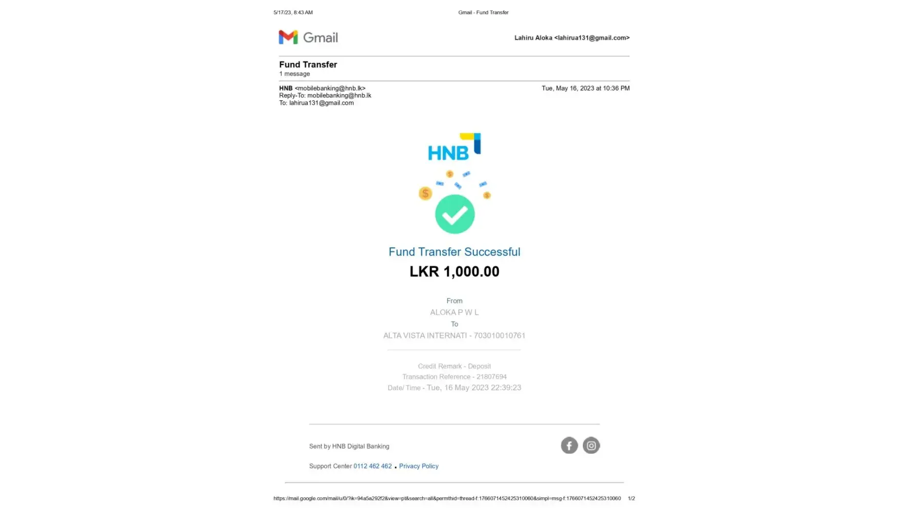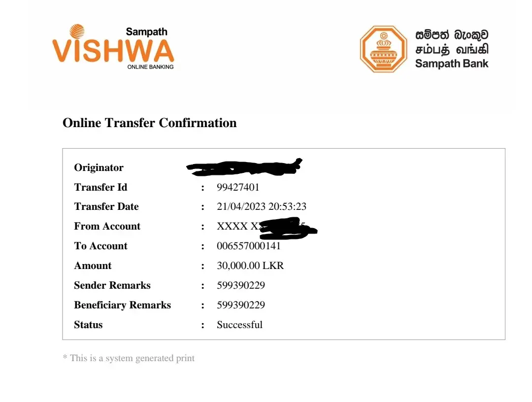 Amount Credited- Rs. 30,000/- (Srilankan Rupees)