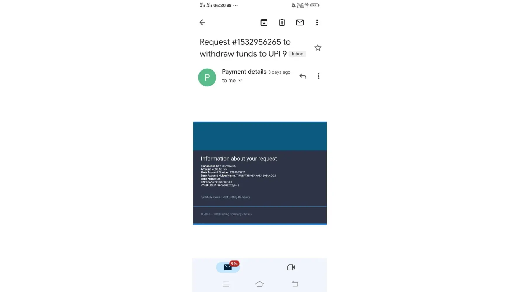 I have placed withdrawal request on 27/04/2023 rupees 4000/- but these time couldn't credit into my saving account.but actual withdrawal time taken is 48 hours only but these request time is over.i can call so many time to 1x bet executives cannot respond correctly.kindly check and solve my issue.