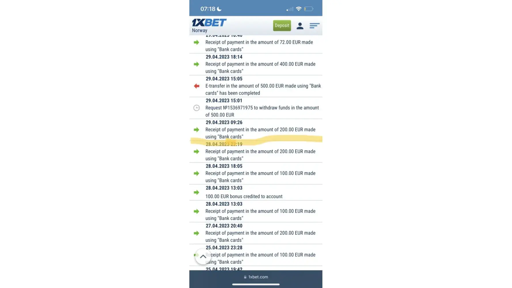 I made a deposit using my debit card last friday at 10pm of 500 euros but the money was never credited on my 1xbet account.