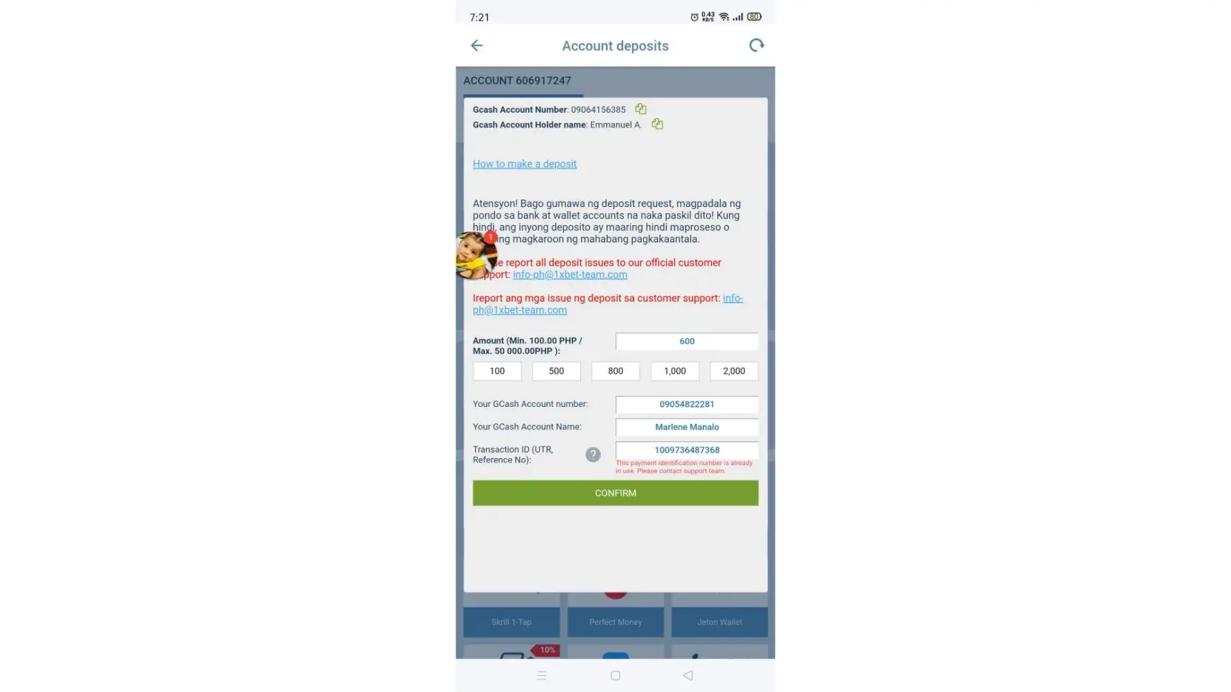 I already submitted screenshots of my proof of payments and the message that it was rejected. until now my deposit is not yet credited. i did not have any mistake in giving the correct deposit information but still it was rejected.
