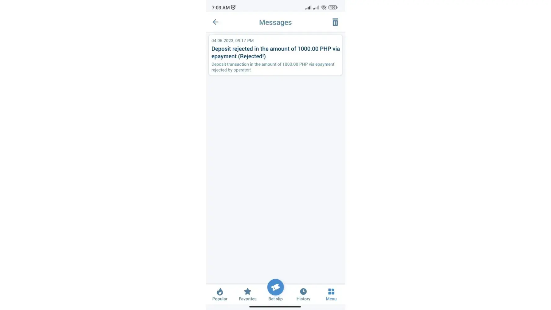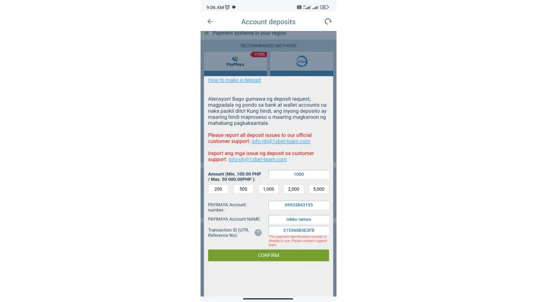 I deposited Php1,000 on May 16 but got a notification that my deposit was rejected.