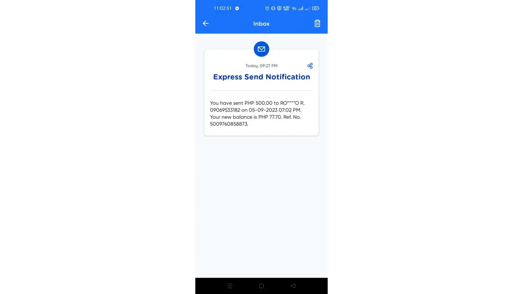 09 May 2023, 09:27 PM Express Send Notification You have sent PHP 500.00 to RO****O R. [protected] on [protected]:02 PM.