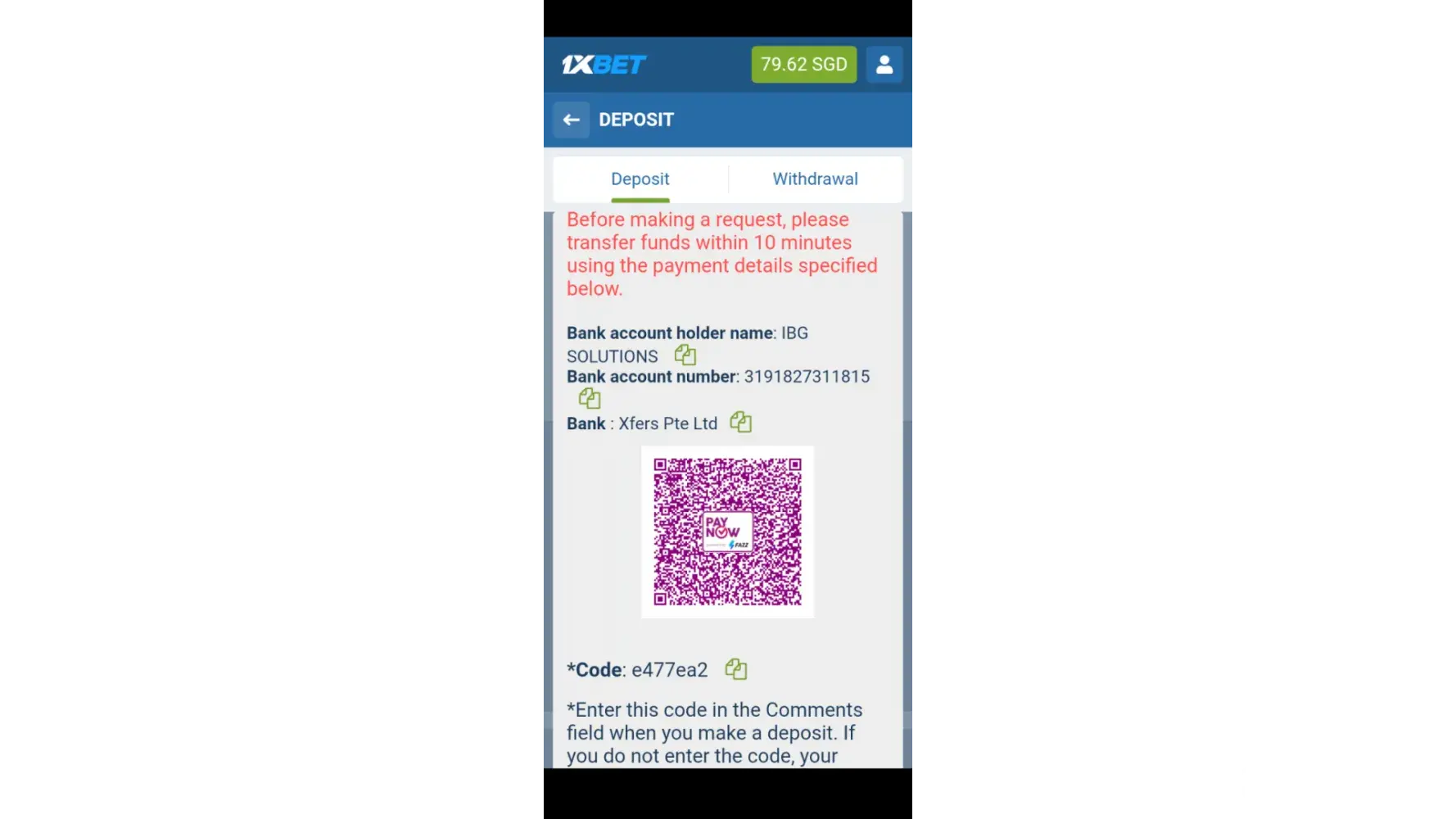 I transfer paynow finished for deposit SGD 50$ .I forget comment code.Idon't get deposit in my 1xbet account. please that deposit in my. 1xbet accoun.