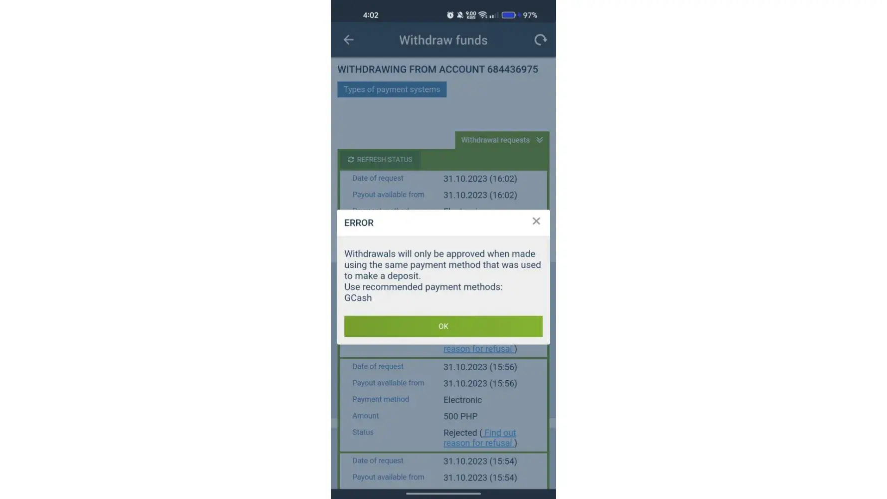 I always use Gcash for my deposits and withdrawals, however, the 1xbet app keeps rejecting it.