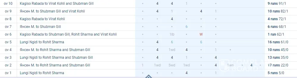 1 - Over, 2 - Delivery, Total Runs Team 1 Over 0.5 India - South Africa
