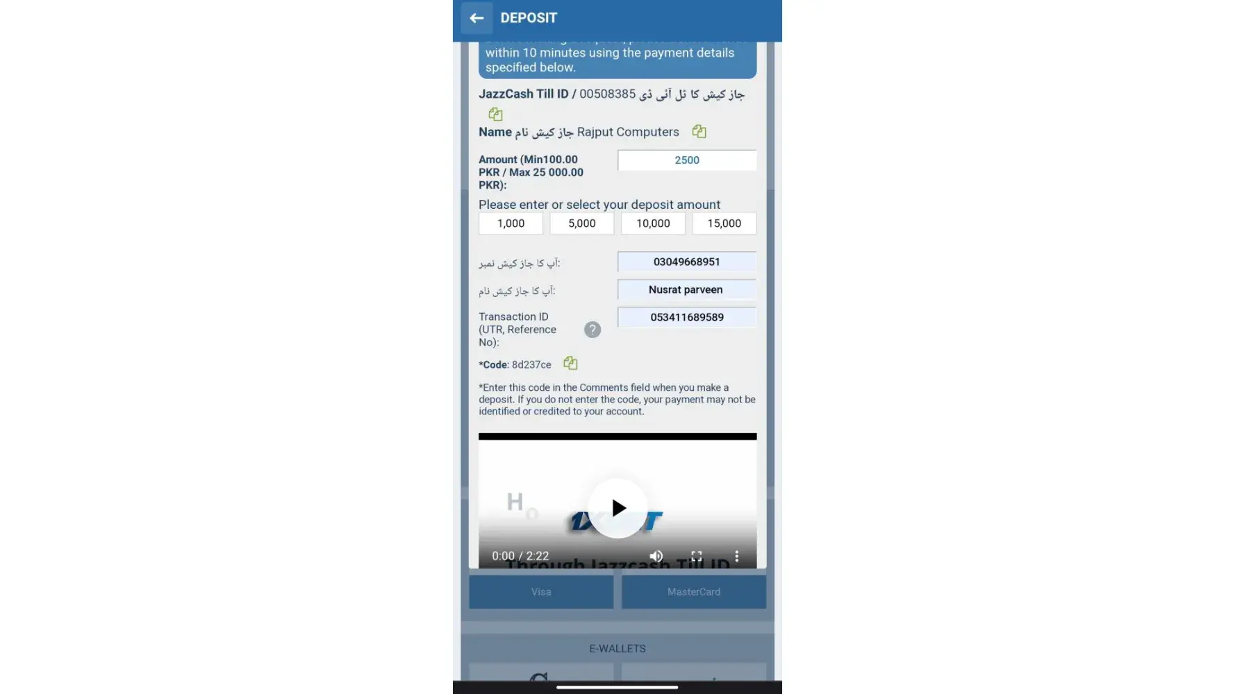 I deposit 2500pkr through jazzcash in my 1xbet account I send money through jazzcash through till payment to