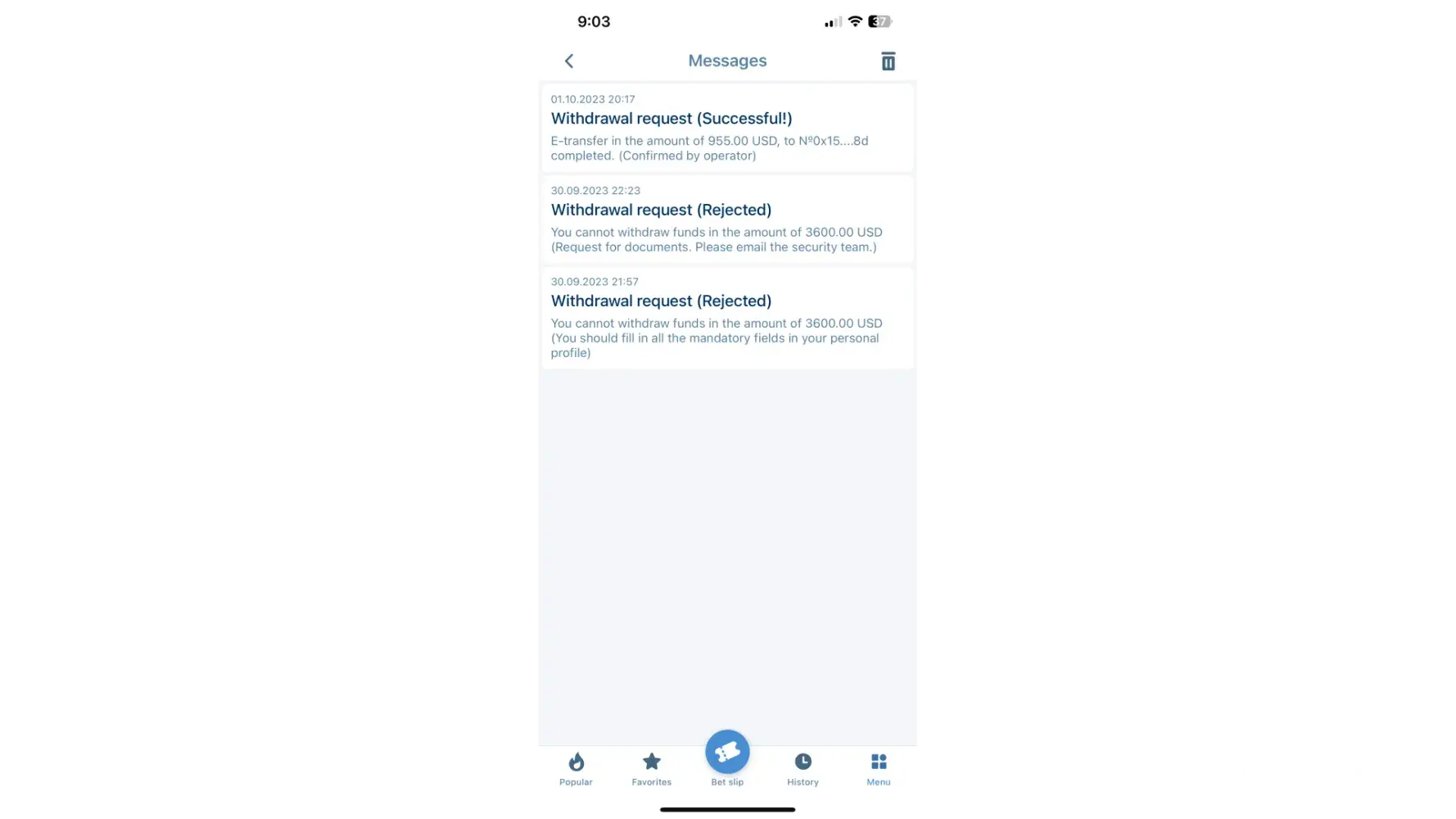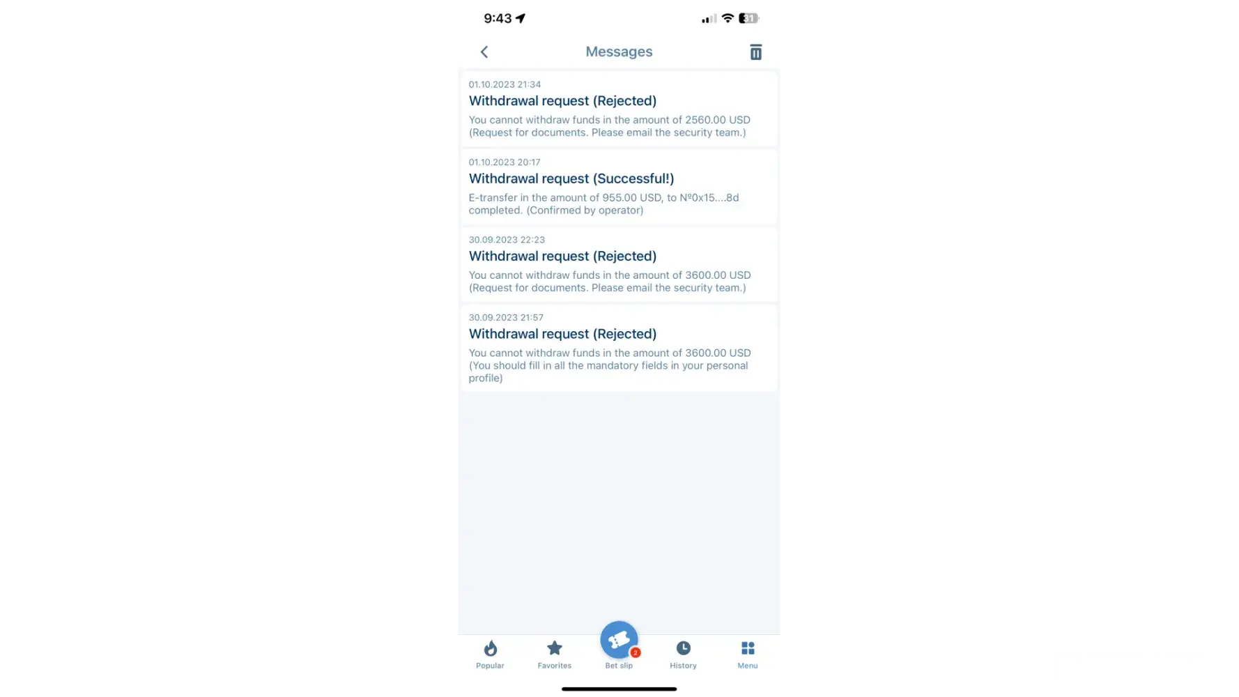 I have been trying to make withdrawal in the amount of 600 dirhams from 1xbet and my registered number is +[protected] this withdrawal request was made on 25/9/2023 I have used MasterCard for the withdrawal request same Mastercard I have used for the deposits and till the time I'm typing this message I have been trying to make a withdrawal and it's rejected I have contacted them many times everytime I get a different consultant name and they say different words they have caused me a delay and they are not processing or willing to help with my withdrawal request I'll share some screen shots of the deposits I have made to them using my Mastercard and the withdrawal requests