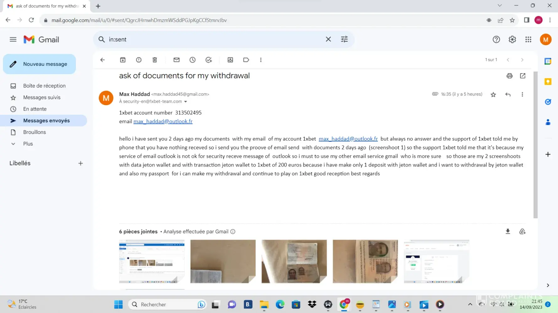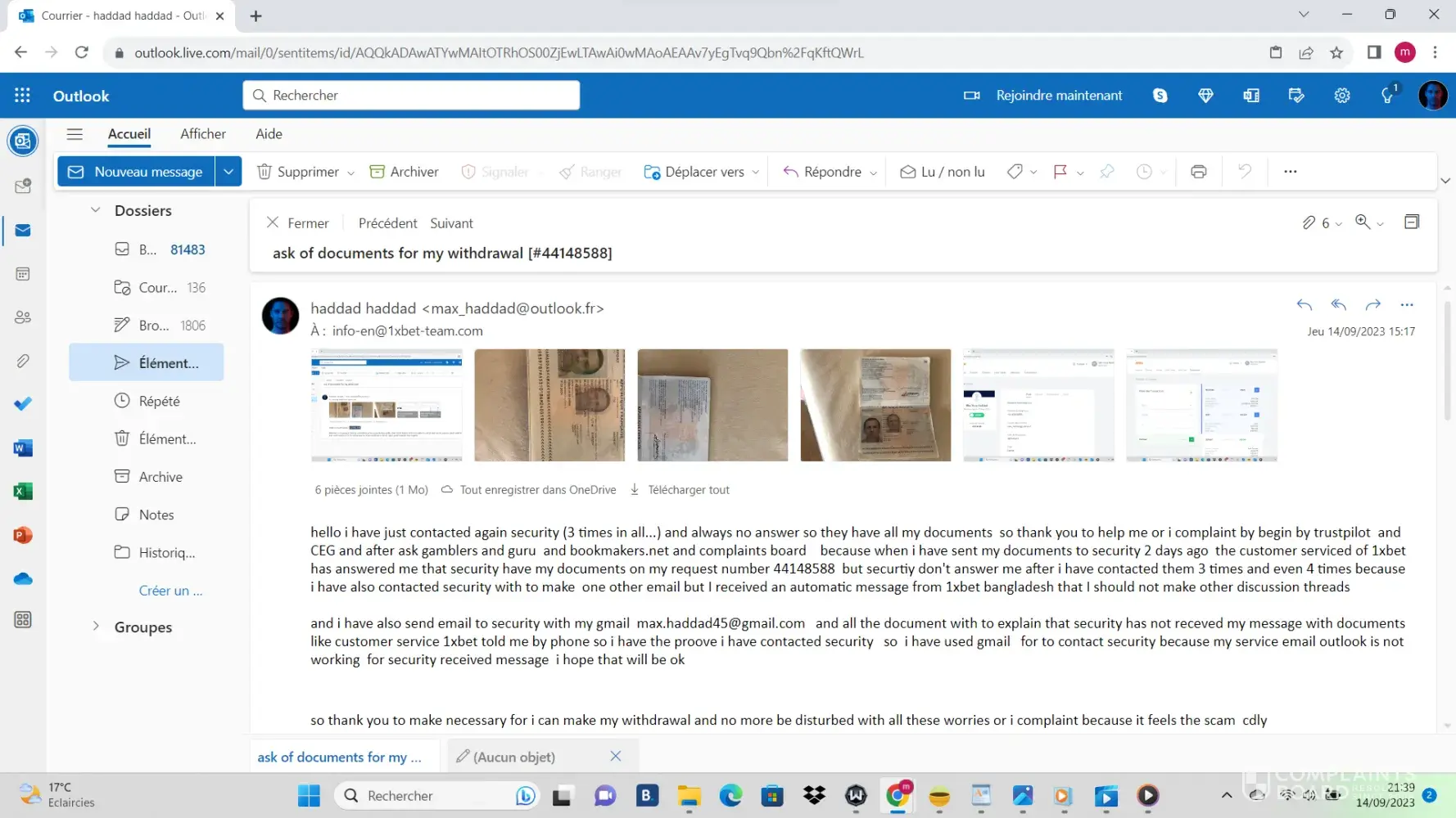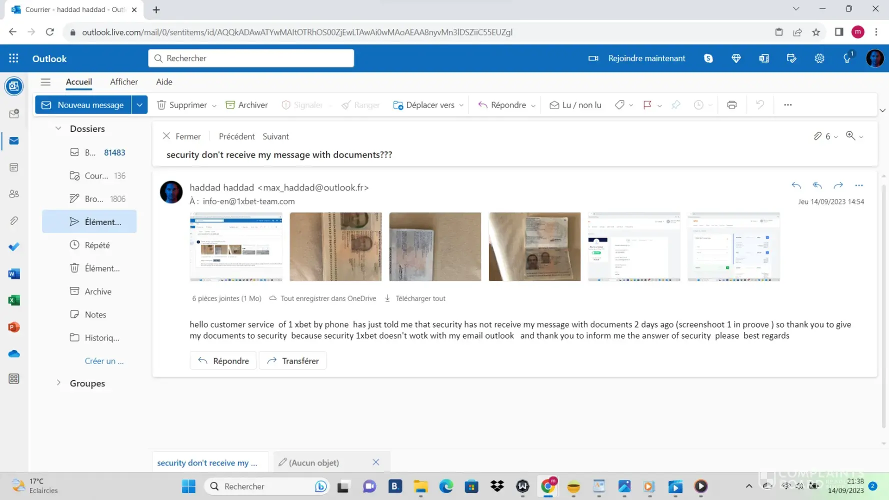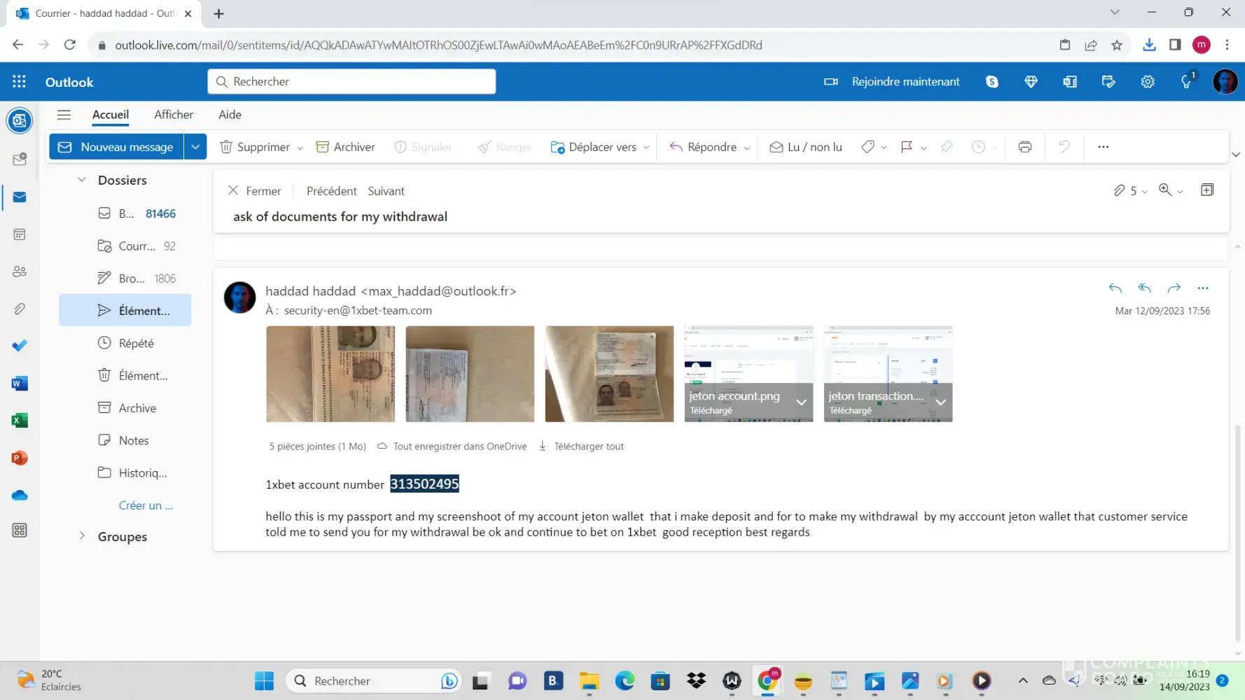 hello, 3 days ago I sent my documents to 1xbet security (2 screenshoots of my jeton wallet account with personal information and proof of the transfer of my jeton wallet account to 1xbet and my passport) but still no response despite having contacted them several times and at best I only receive an acciuse reception su 1xbet customer service from Bangladesh? while I sent my documents to the English security service of 1xbet... and when I ask the English customer service of 1xbet by email to help me because apparently security of 1xbet has not received my documents as the customer service confirmed to me from 1xbet by phone they tell me to contact security when it doesn't work when I contact security so they really take me for an idiot and so I tried to contact security with my other gmail email address (because maybe the email address of my outlook email service cannot reach security) it's the same thing no security response from 1xbet... except an acknowledgment of receipt from 1xbet customer service from Bangladesh... here is the proof of my passport documents and 2screenshoots of my token wallet account and the proof that I contacted security of 1xbet and the English customer service of 1xbet which does nothing to help me thank you for forcing them to pay my winnings and stop trying to scam me please thank you very much best regards