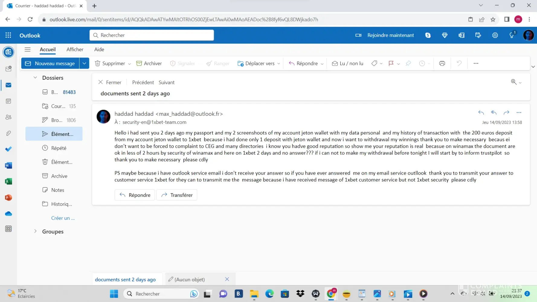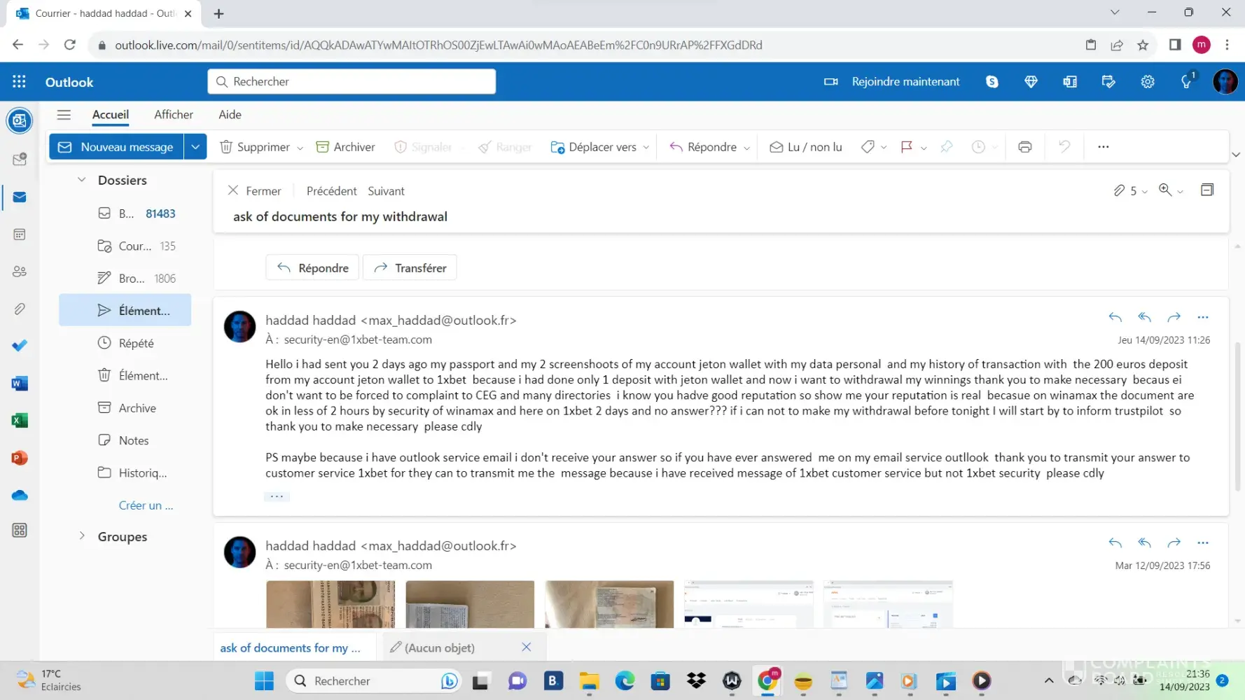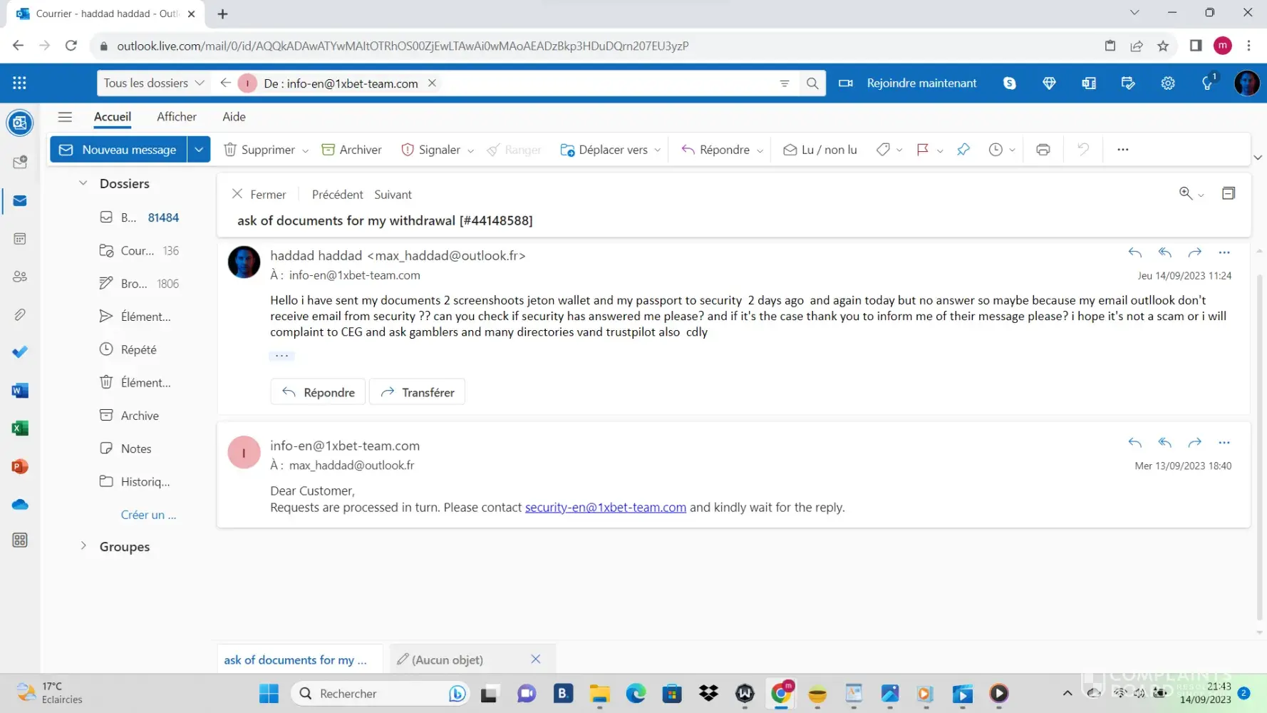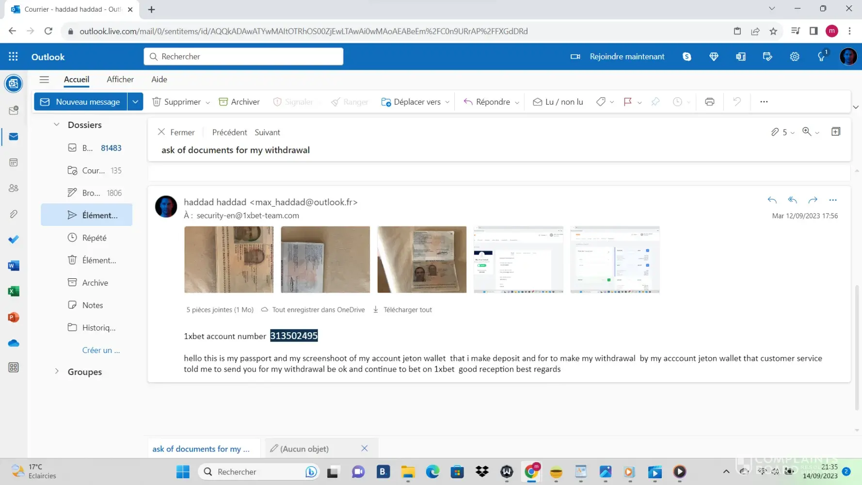 hello, 3 days ago I sent my documents to 1xbet security (2 screenshoots of my jeton wallet account with personal information and proof of the transfer of my jeton wallet account to 1xbet and my passport) but still no response despite having contacted them several times and at best I only receive an acciuse reception su 1xbet customer service from Bangladesh? while I sent my documents to the English security service of 1xbet... and when I ask the English customer service of 1xbet by email to help me because apparently security of 1xbet has not received my documents as the customer service confirmed to me from 1xbet by phone they tell me to contact security when it doesn't work when I contact security so they really take me for an idiot and so I tried to contact security with my other gmail email address (because maybe the email address of my outlook email service cannot reach security) it's the same thing no security response from 1xbet... except an acknowledgment of receipt from 1xbet customer service from Bangladesh... here is the proof of my passport documents and 2screenshoots of my token wallet account and the proof that I contacted security of 1xbet and the English customer service of 1xbet which does nothing to help me thank you for forcing them to pay my winnings and stop trying to scam me please thank you very much best regards