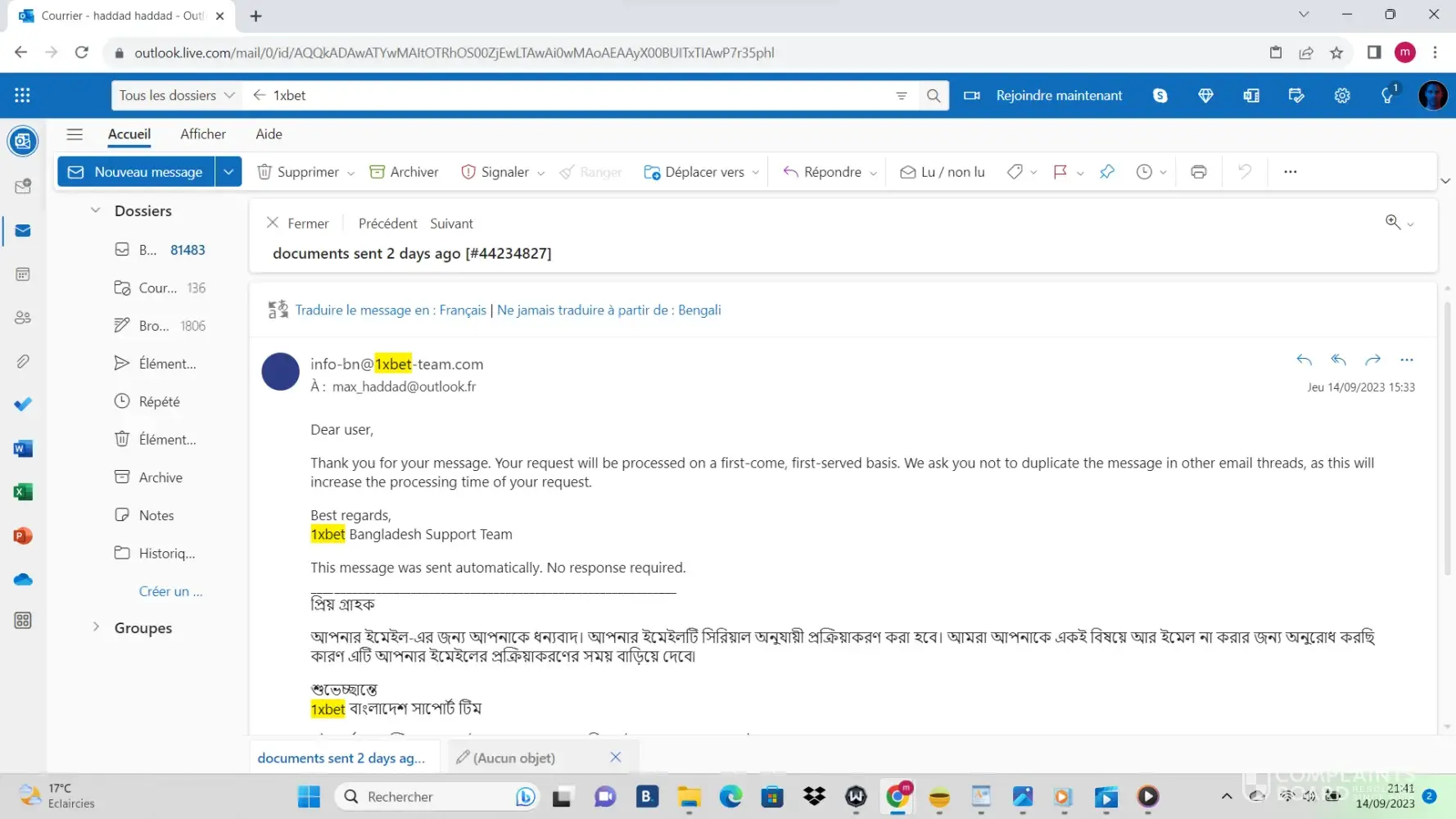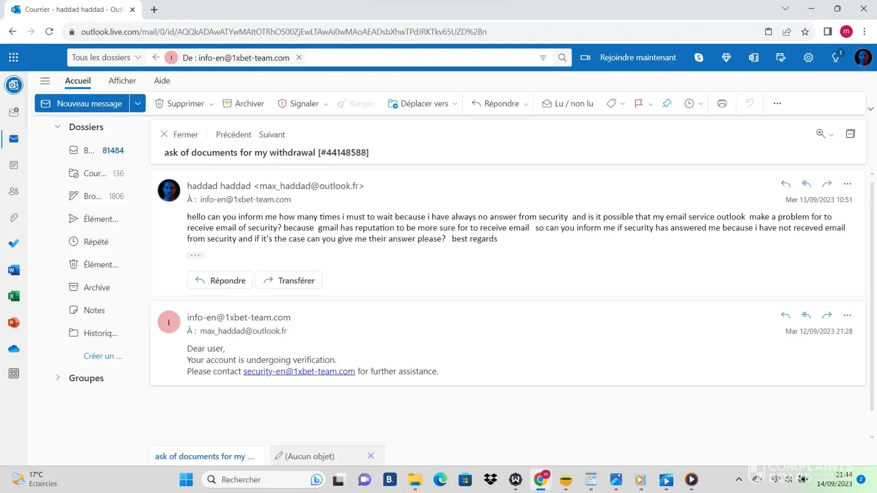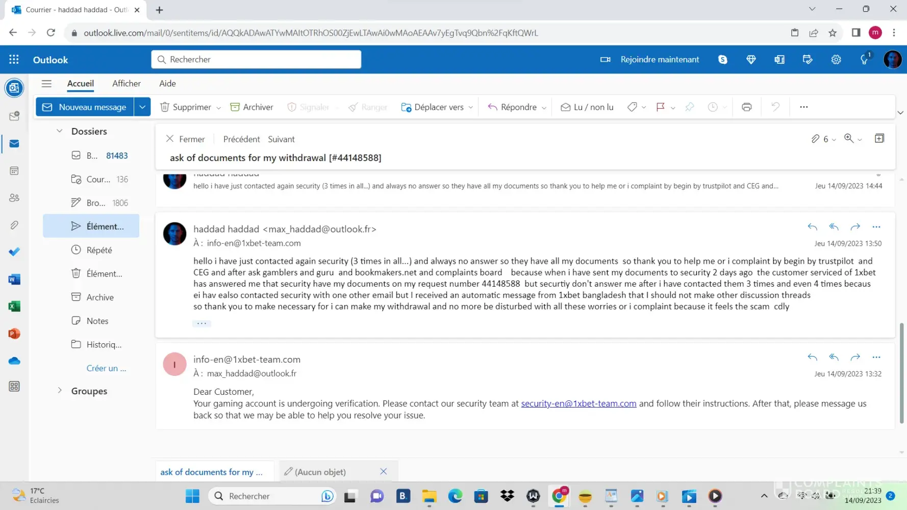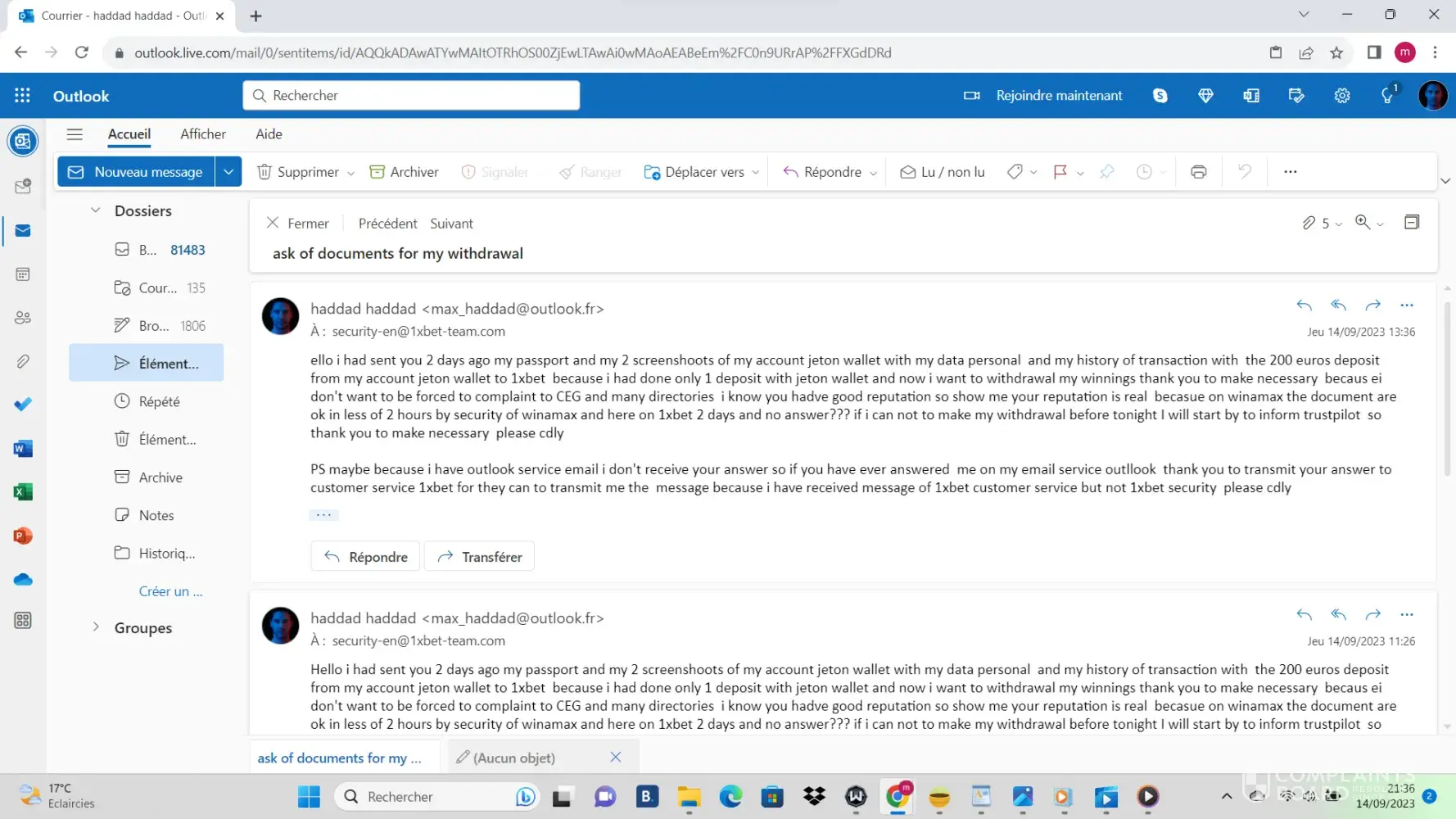 hello, 3 days ago I sent my documents to 1xbet security (2 screenshoots of my jeton wallet account with personal information and proof of the transfer of my jeton wallet account to 1xbet and my passport) but still no response despite having contacted them several times and at best I only receive an acciuse reception su 1xbet customer service from Bangladesh? while I sent my documents to the English security service of 1xbet... and when I ask the English customer service of 1xbet by email to help me because apparently security of 1xbet has not received my documents as the customer service confirmed to me from 1xbet by phone they tell me to contact security when it doesn't work when I contact security so they really take me for an idiot and so I tried to contact security with my other gmail email address (because maybe the email address of my outlook email service cannot reach security) it's the same thing no security response from 1xbet... except an acknowledgment of receipt from 1xbet customer service from Bangladesh... here is the proof of my passport documents and 2screenshoots of my token wallet account and the proof that I contacted security of 1xbet and the English customer service of 1xbet which does nothing to help me thank you for forcing them to pay my winnings and stop trying to scam me please thank you very much best regards