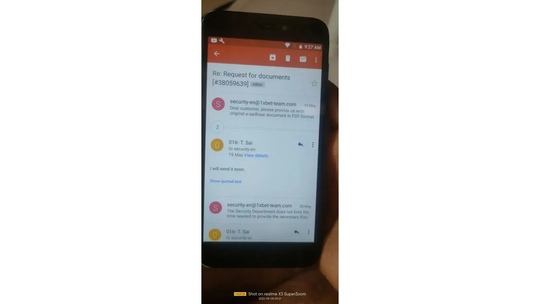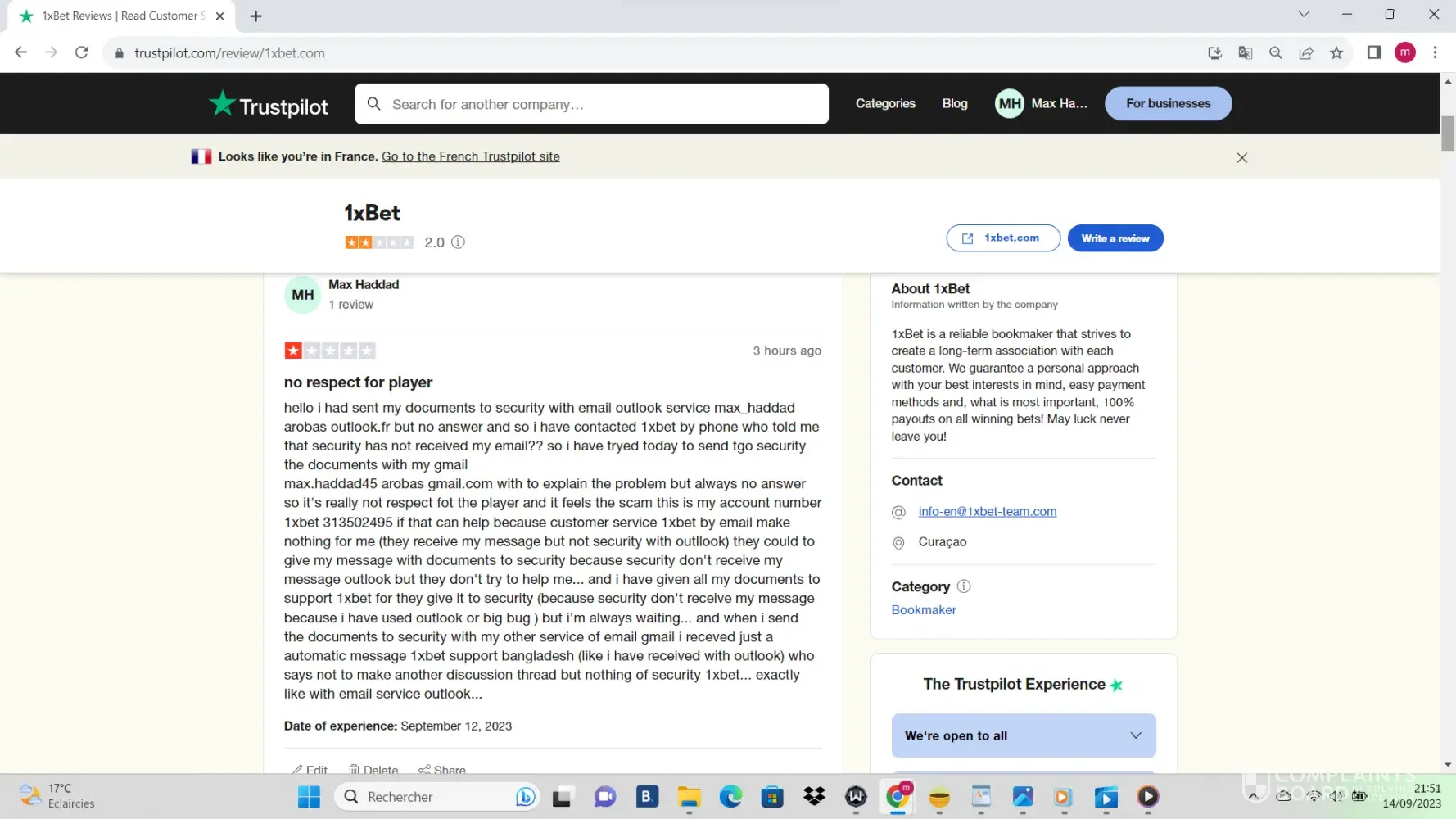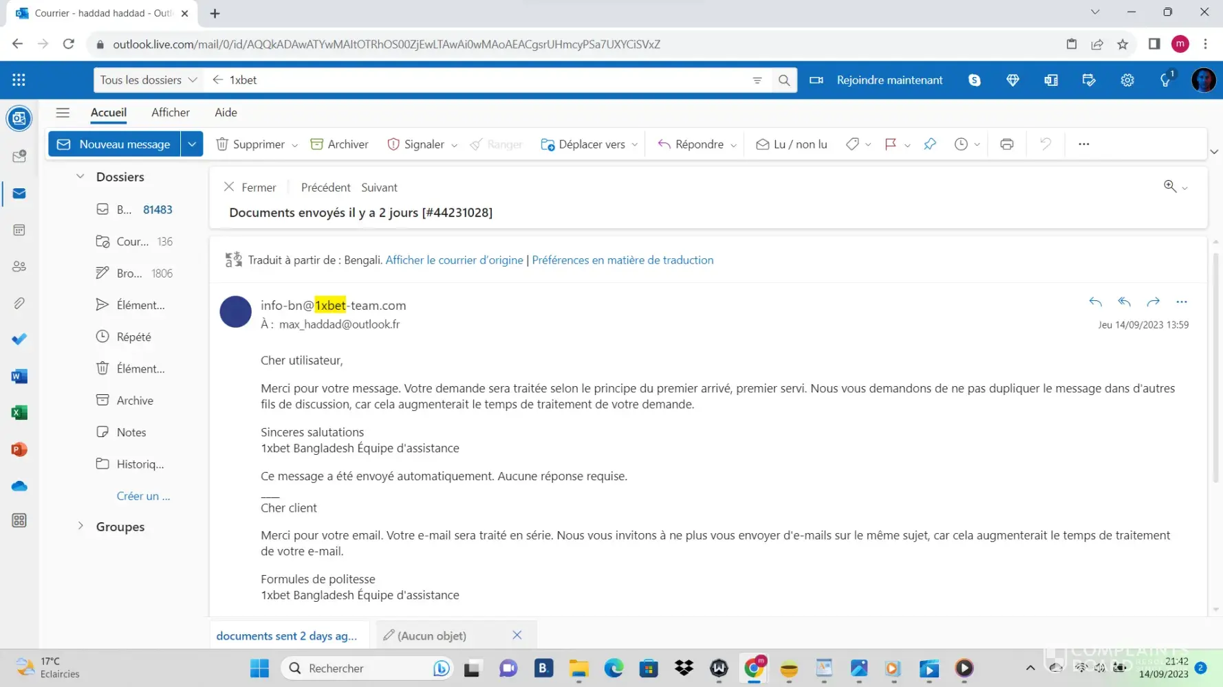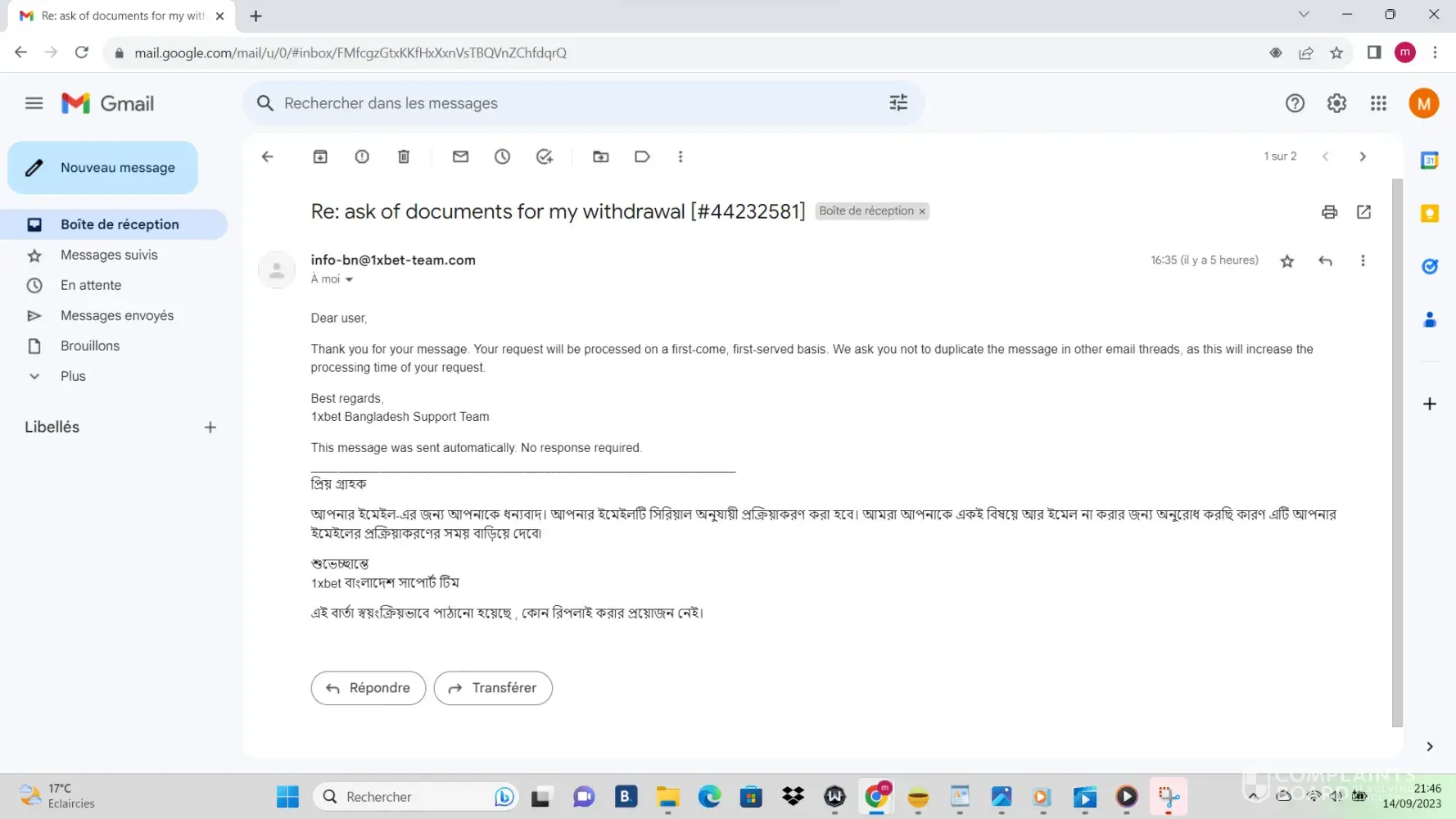 hello, 3 days ago I sent my documents to 1xbet security (2 screenshoots of my jeton wallet account with personal information and proof of the transfer of my jeton wallet account to 1xbet and my passport) but still no response despite having contacted them several times and at best I only receive an acciuse reception su 1xbet customer service from Bangladesh? while I sent my documents to the English security service of 1xbet... and when I ask the English customer service of 1xbet by email to help me because apparently security of 1xbet has not received my documents as the customer service confirmed to me from 1xbet by phone they tell me to contact security when it doesn't work when I contact security so they really take me for an idiot and so I tried to contact security with my other gmail email address (because maybe the email address of my outlook email service cannot reach security) it's the same thing no security response from 1xbet... except an acknowledgment of receipt from 1xbet customer service from Bangladesh... here is the proof of my passport documents and 2screenshoots of my token wallet account and the proof that I contacted security of 1xbet and the English customer service of 1xbet which does nothing to help me thank you for forcing them to pay my winnings and stop trying to scam me please thank you very much best regards