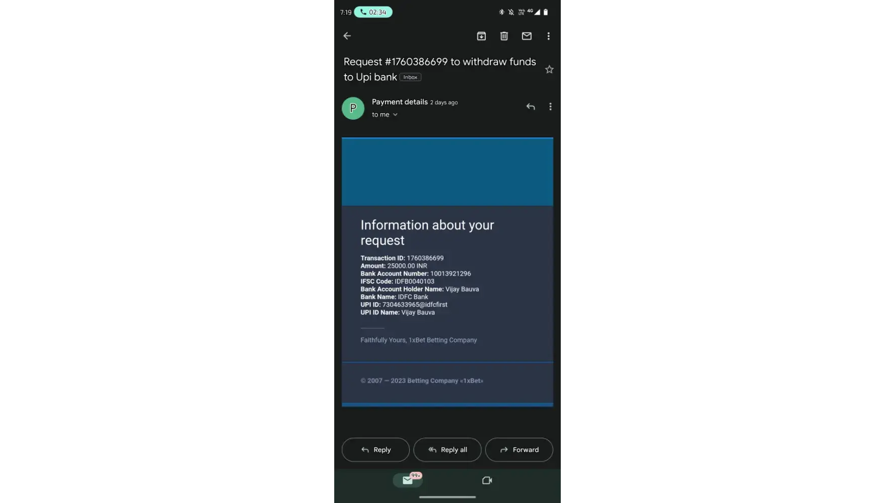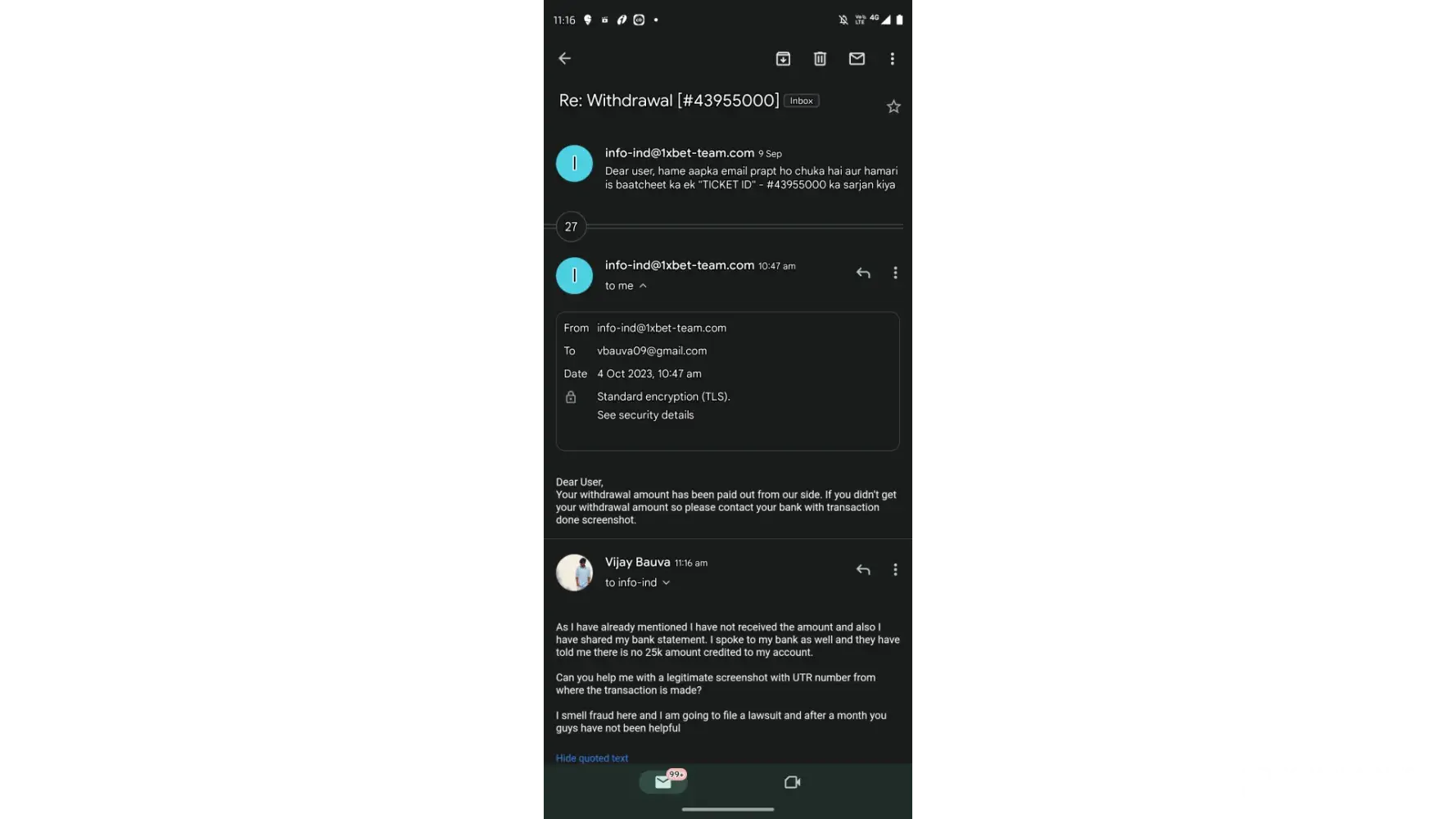 There is still no update, they are just asking me to send screenshots and documents wherein I have shared my bank statement clearly and I haven't received the funds, it's a clear thing that the operator has received the funds back and 1xbet should ask the operator for their bank statement as I have clearly not received 25k in my account.