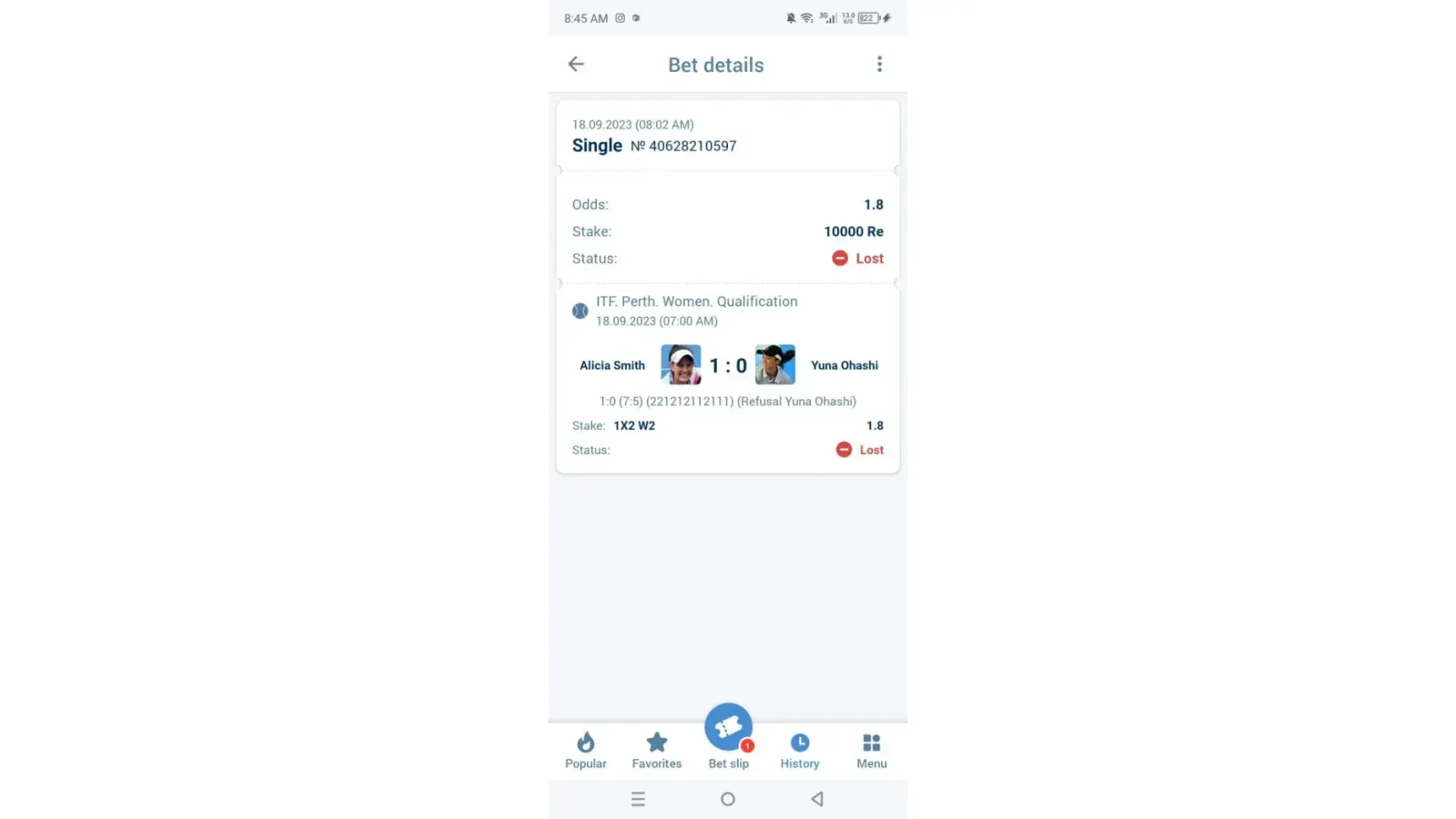 i bet on player 2 in 2nd set player 1 refuse to play i also watching live streaming but 1xbet give wrong result and make my bet as lose offical result link