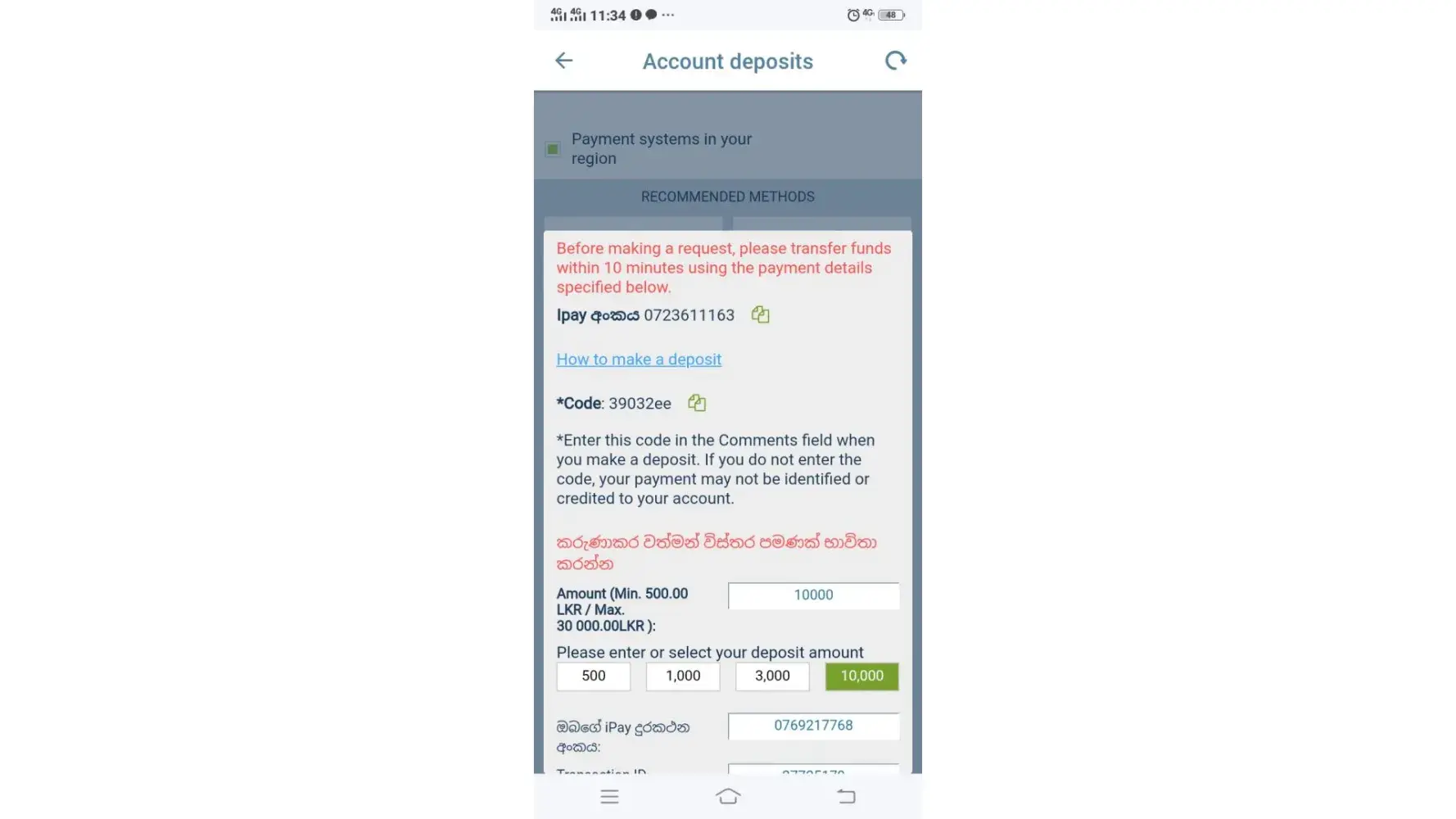 Appreciate if you could check and deposit amount of Rs10,000 to my 1xbet account