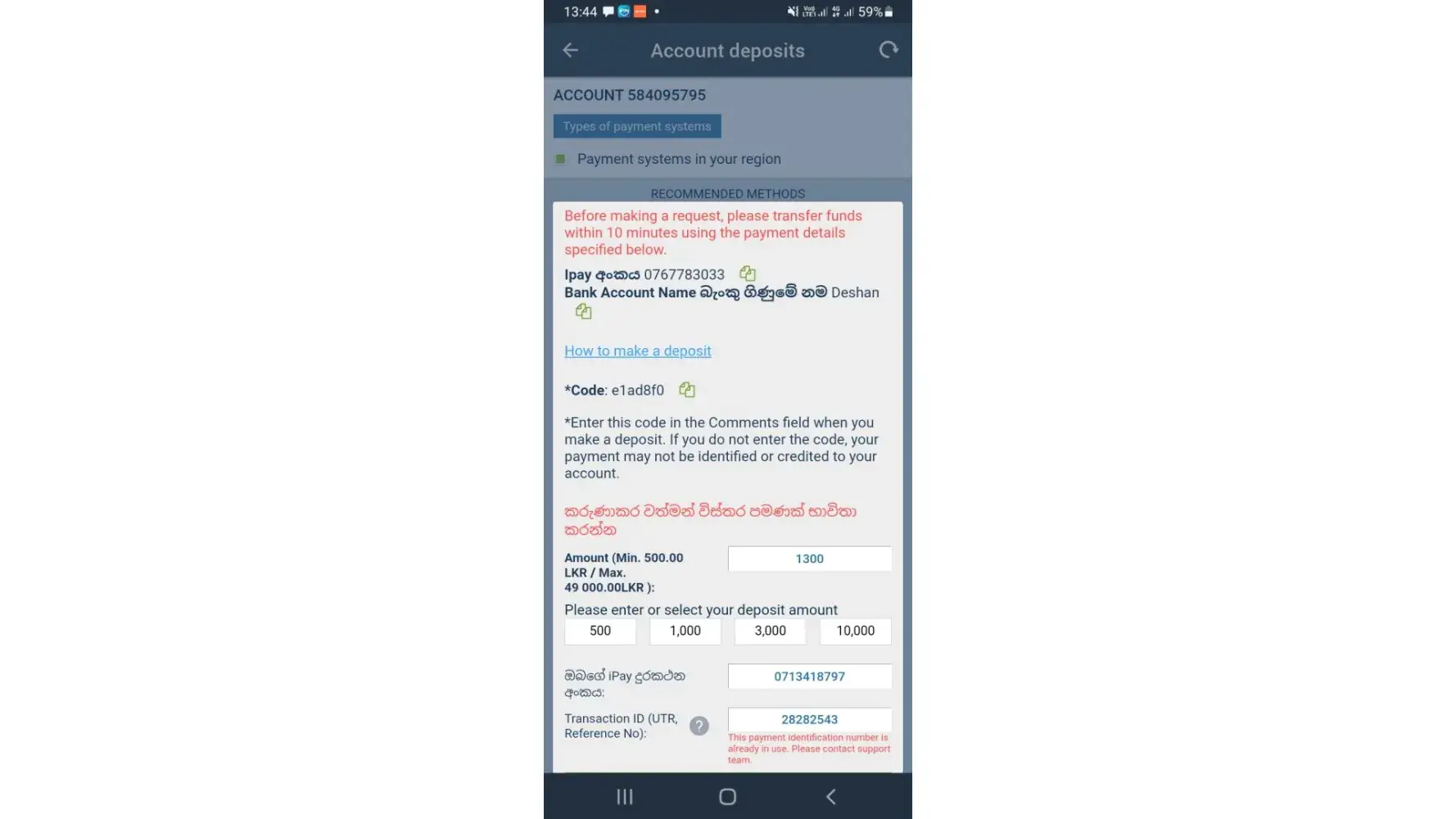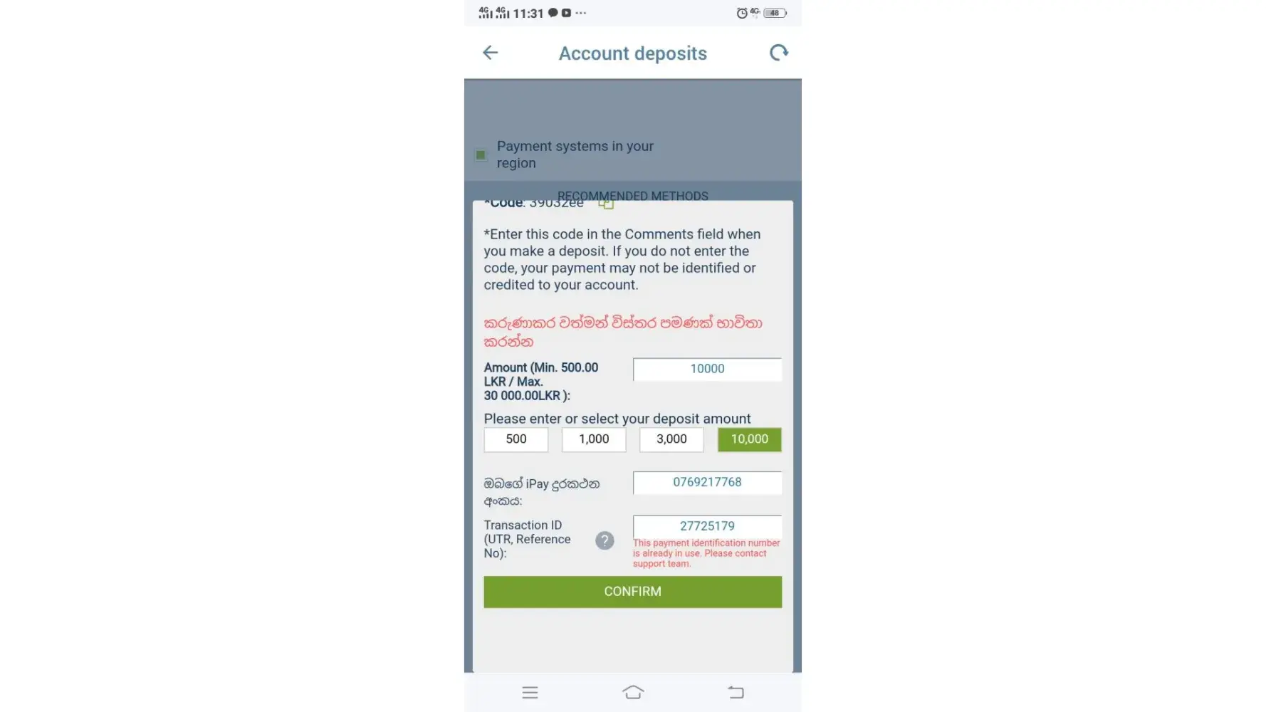 But when I'm trying to confirm the recharge confirmation from 1Xbet app, i was unable to do it because of the reason of "Payment identification number in use" as shown in screenshot, and my deposited money not yet received to my 1Xbet account.