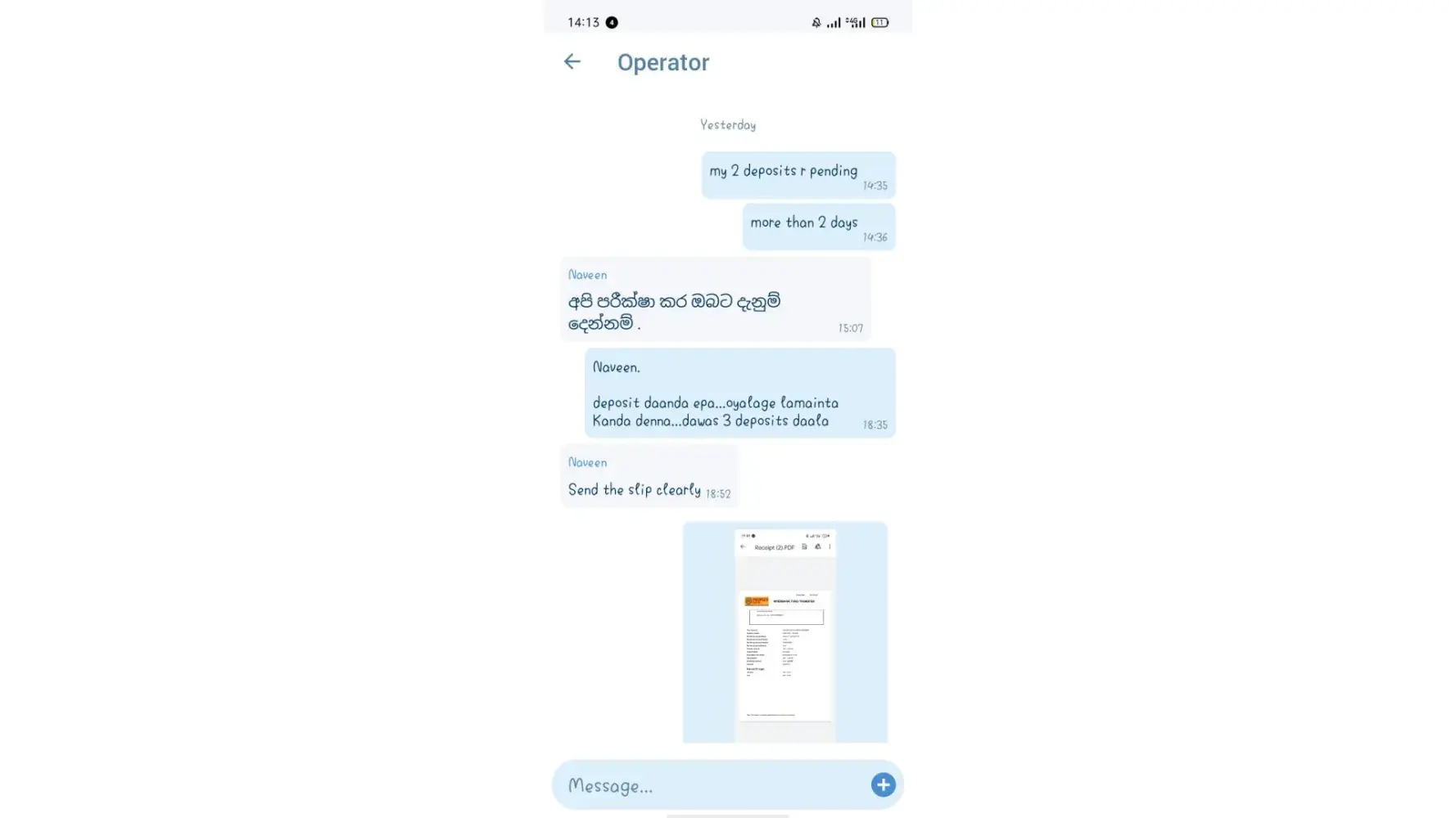 I am complaining regards deposit not come in my account