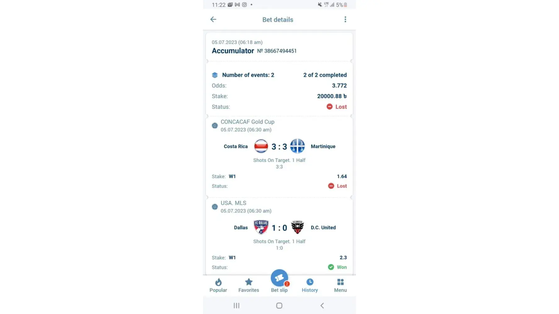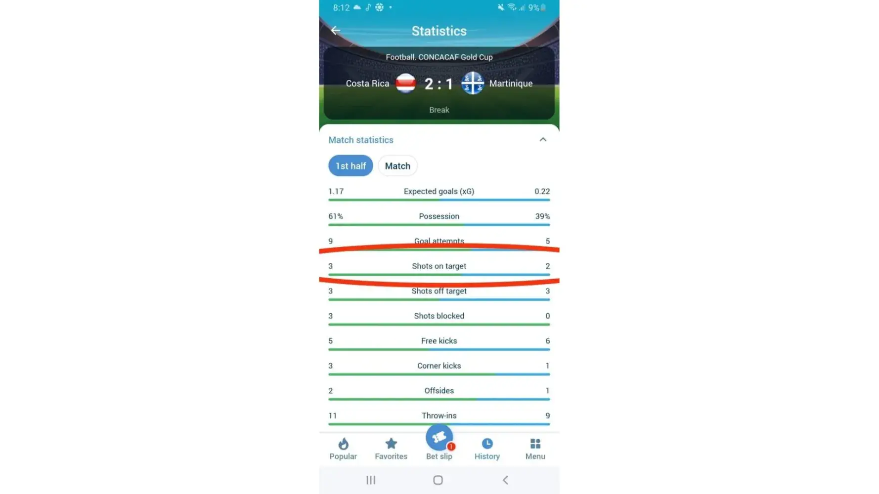This slip contains the wrong answer . In official side COSTA Rica shots on target score is 3 and Martinique shots on target score is 2 . So please recalculate my bet slip and add my winning money.
