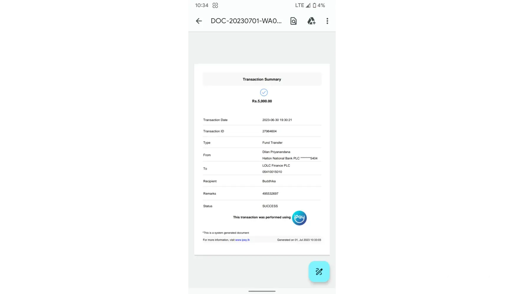 I have deposited Rs10,000 to one of your agent(ipay number: [protected]) via ipay app for recharge my 1xbet account on today(27/06/2023) at 11:25