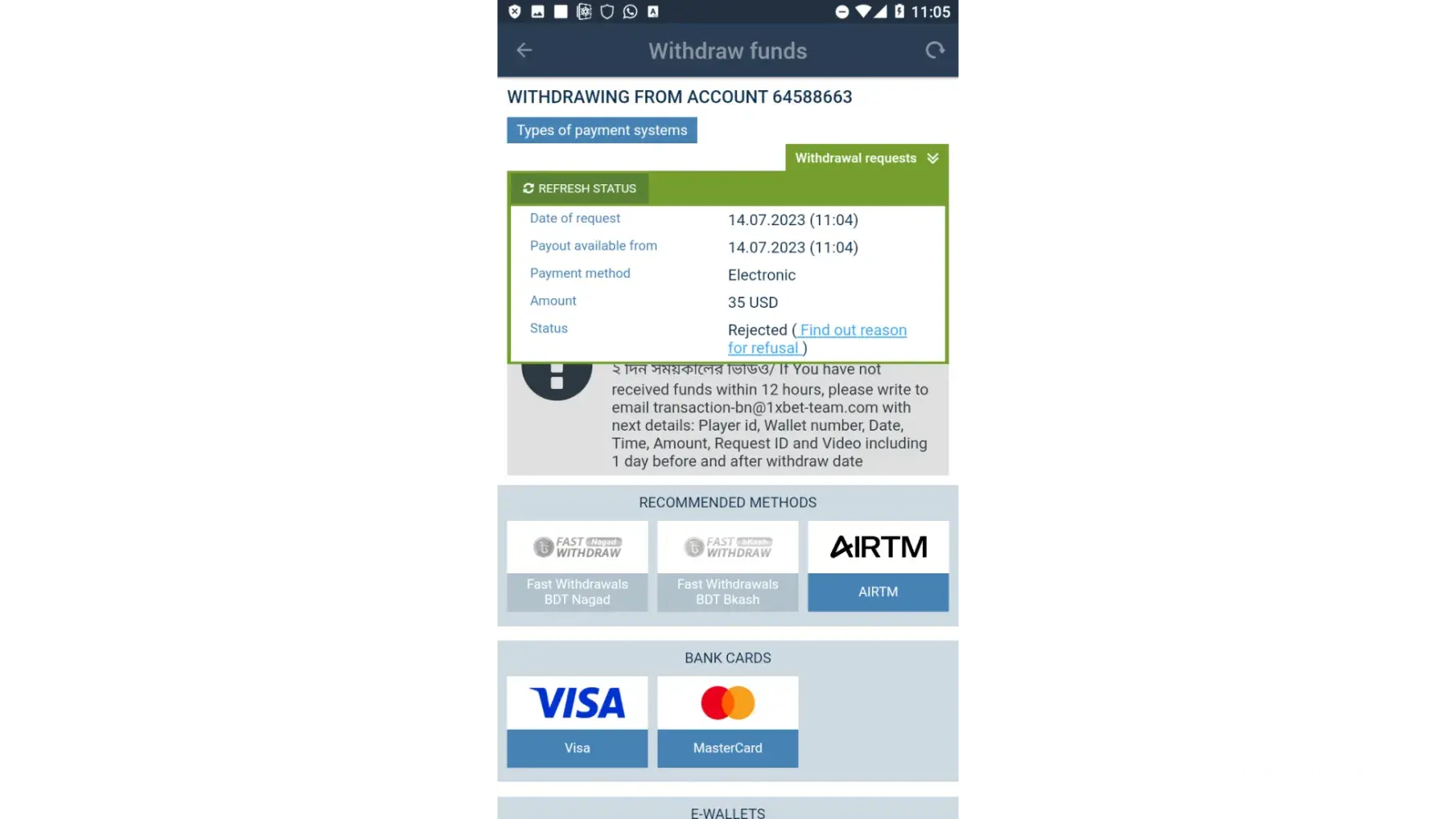 I am a 1xbet gamaing account holder. My account is [protected]. When my account open then i can able my account deposit and withdral through bangladeshi e wallet and bank account transfer. But now i can not able my account deposit and withdral through bangladeshi e wallet and bank account transfer use that means above option not shown my account. So resolve this issue as soon as possible.