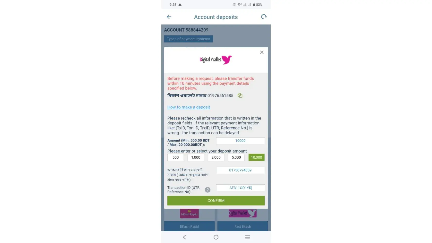 They ask me to deposit same amount. I deposited of taka-10000/- to this number from your automated system +[protected] from my bkash wallet number +[protected] but they immediately reject it but I don’t know why. Screenshots are attached