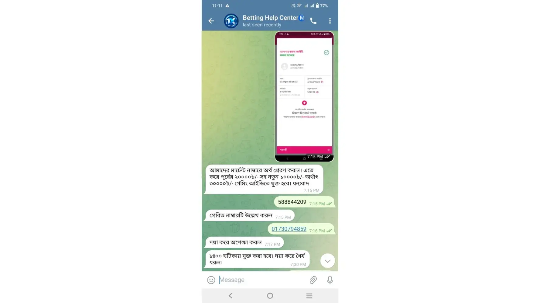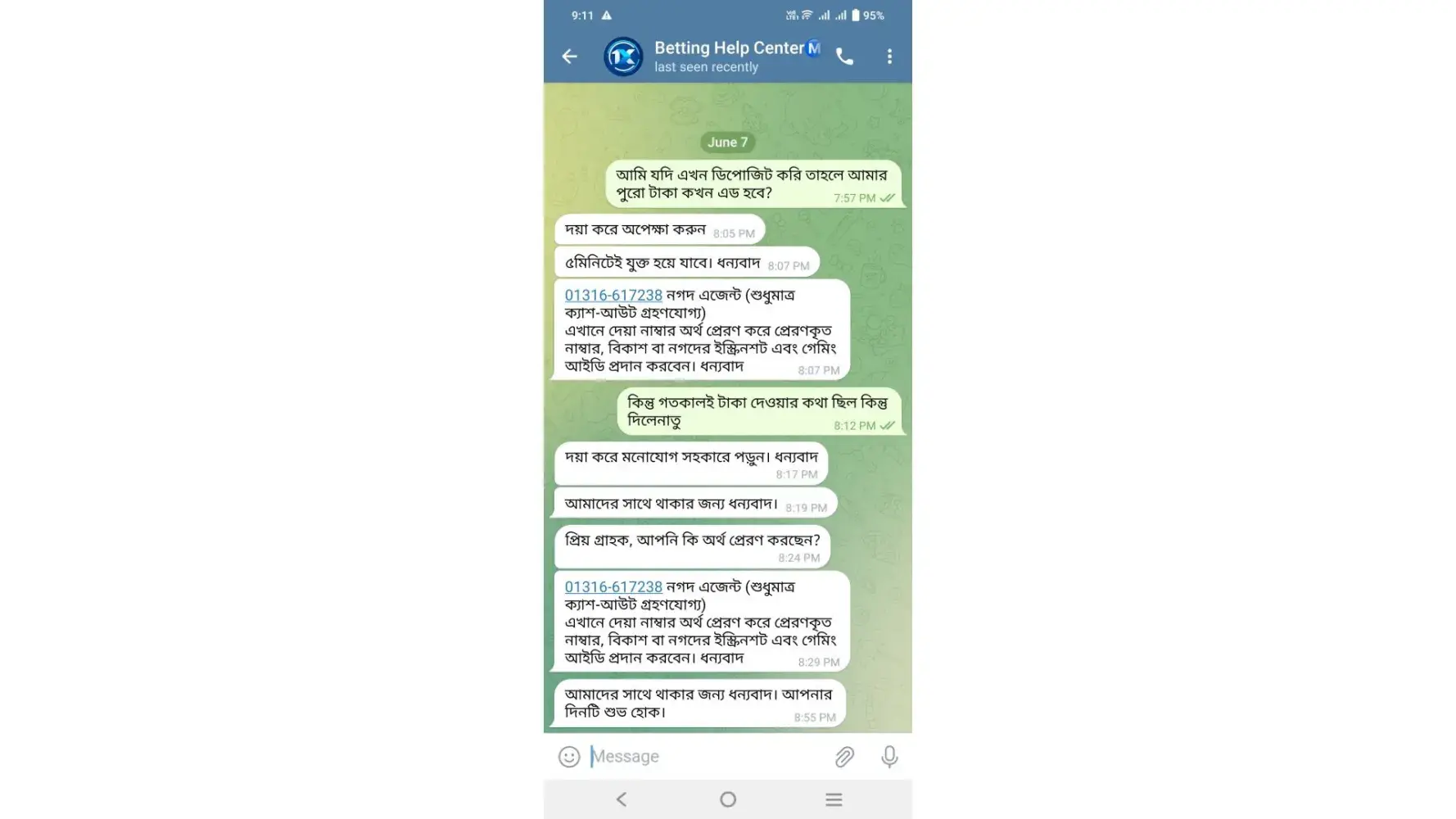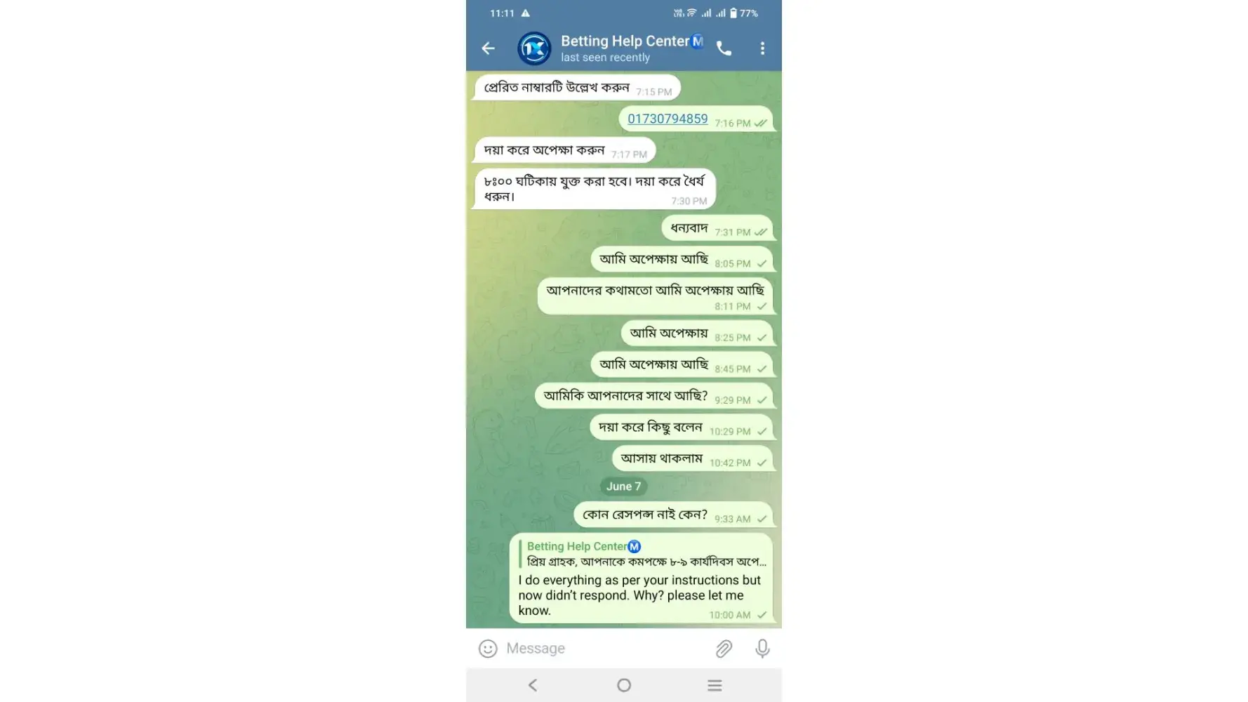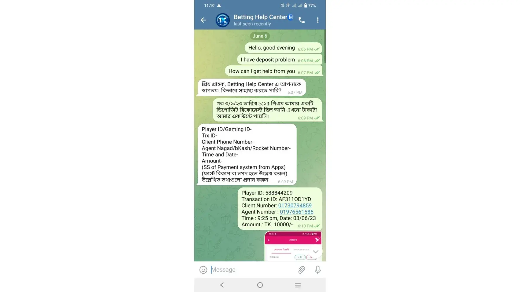 You refer to contact with this number: +[protected] (whatsapp only). I contact with them. As per their instructions I installed “Telegram†and he given me a link to contact Betting Help Center +[protected] accordingly I knocked them to this number and they converse with me in my native language (Bangla). (All screenshots are attached herewith.)