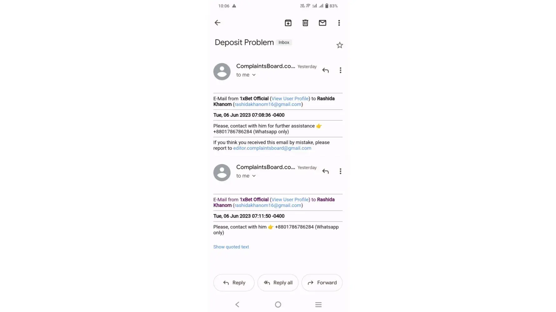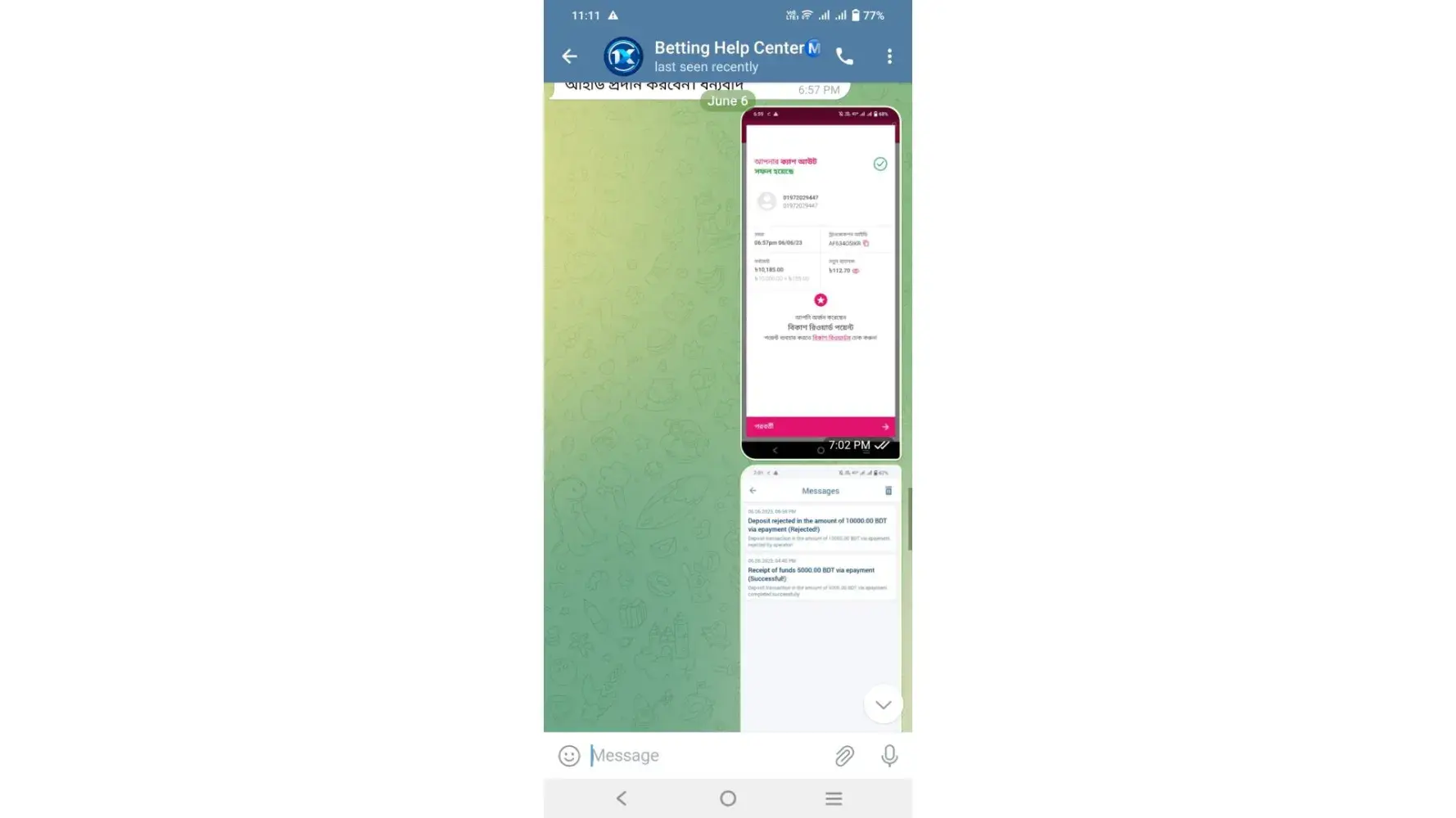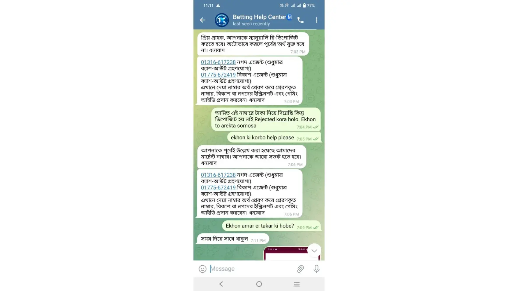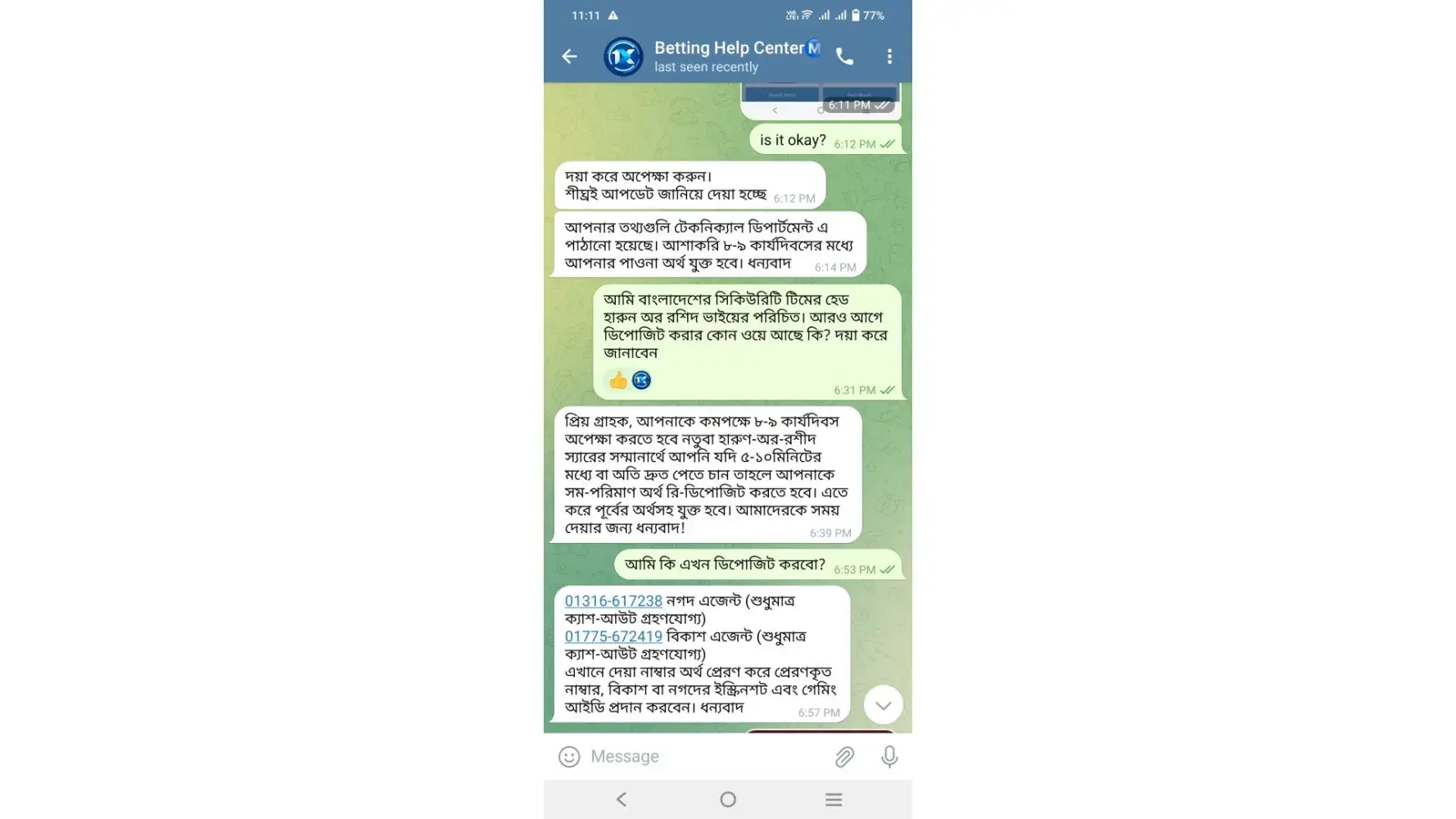 You refer to contact with this number: +[protected] (whatsapp only). I contact with them. As per their instructions I installed “Telegram†and he given me a link to contact Betting Help Center +[protected] accordingly I knocked them to this number and they converse with me in my native language (Bangla). (All screenshots are attached herewith.)