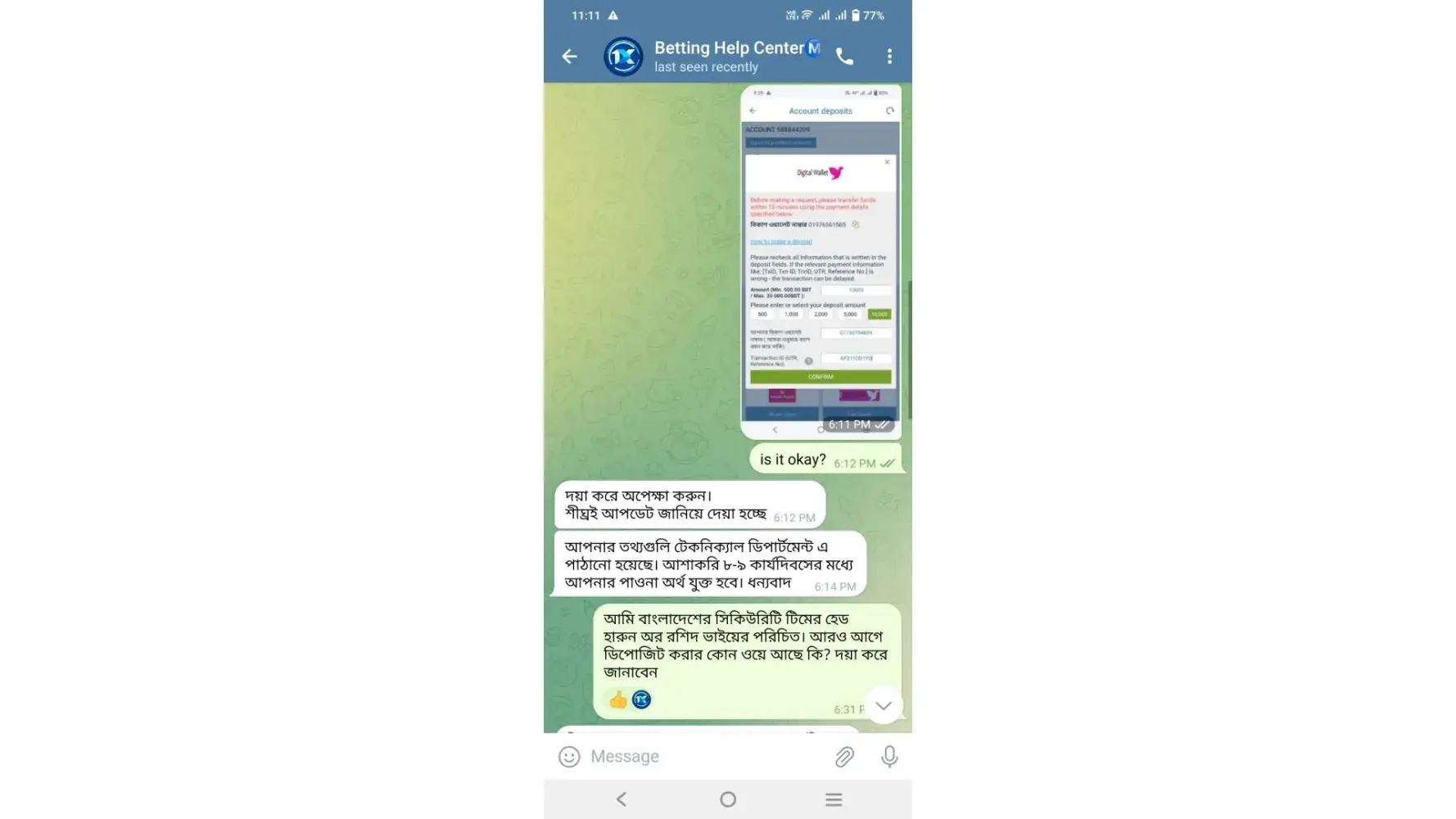 Ami amar 1xbet I'd te aj sokale deposit ar jonno digital wallet method ar maddhome ajent number a 5000 taka pament kori.tar por je transaction I'd asce ta diya sathe sathe try Kori deposit korar jonno.kinto tokon transaction I'd already use lekha ase.tar mor ami online Chat a jogajog kori sob detail diya .tarpor amake janano hoi amar taka etimodde deya hoyace.ami check kore dekhe add hoi nai .tarpor janale bole onno id te ai transaction babohar kore deposit kora hoyace.sodo ajent bade Kew ai transaction I'd too janar kotha na.r atto fast deposit ajent bade Kew korbe na.amar I'd details niche deya holo