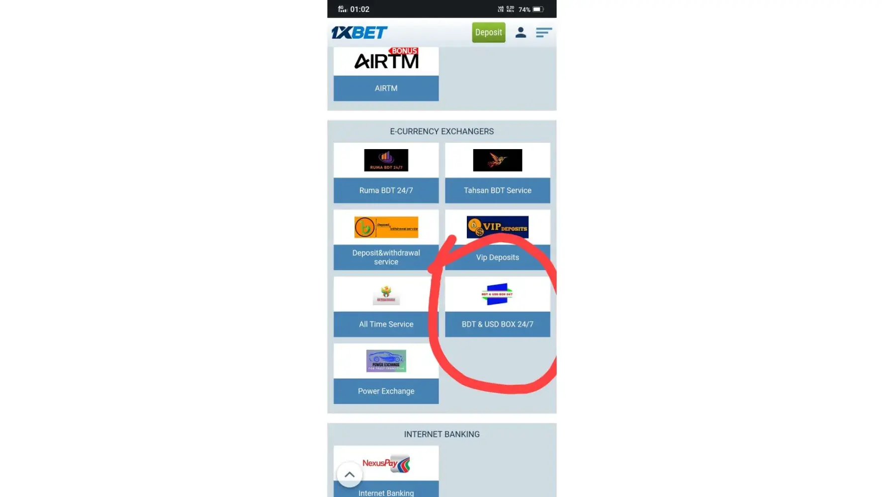 Deposit from 1xbet's deposit section to the exchanger 'BDT & USD BOX 24/7' mentioned in the E-currency exchanger option. They did not pay my 1xbet account after receiving money from me through bkash and misbehaved. Proof that I paid them and records of my telegram conversation with them are attached to my complaint.