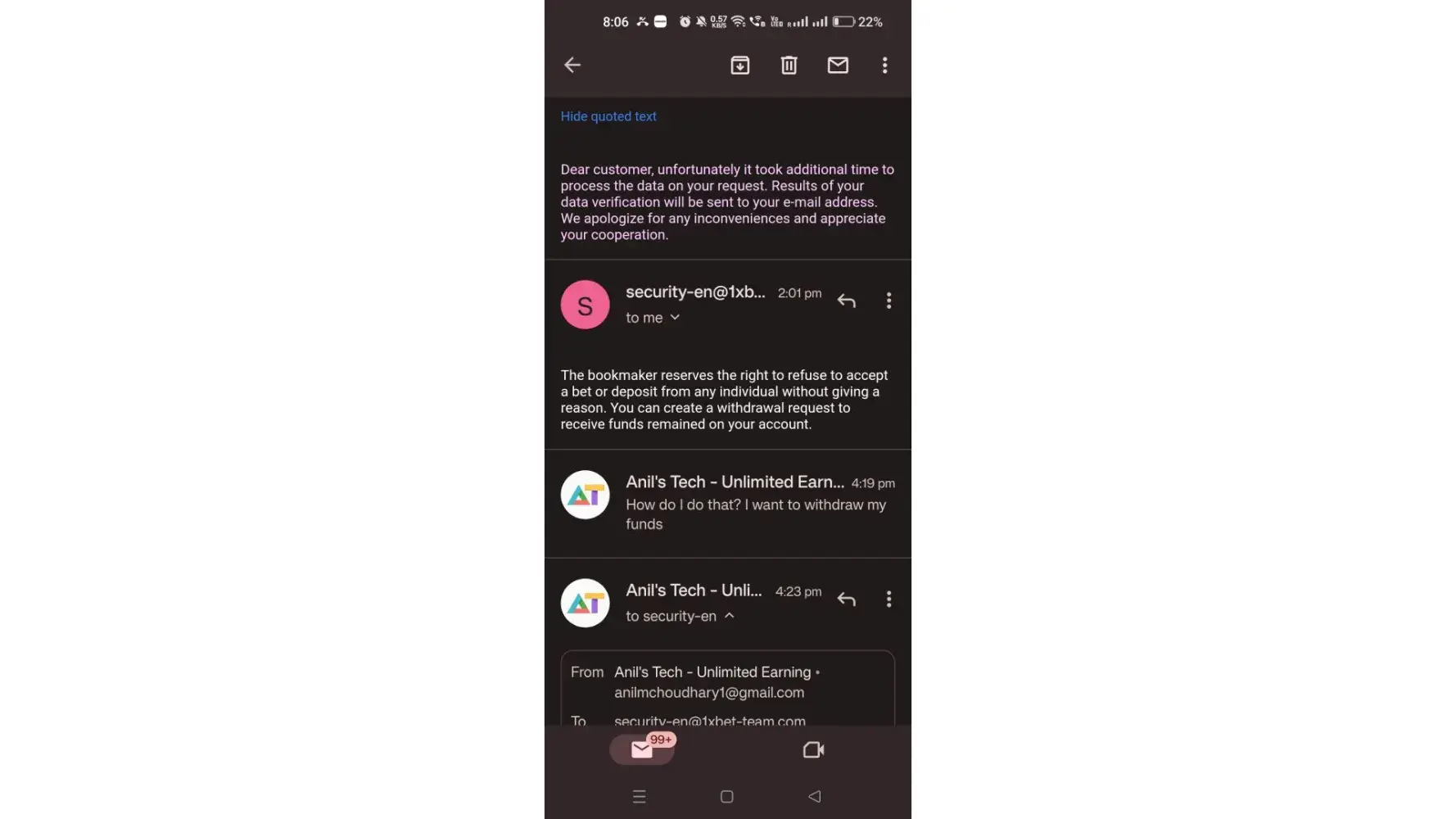 And then from the website "1xbet.com", they told me "The latest you got from security department is from march, are you sure about that? and I said yes I'm sure. and then they didn't say anything. Please follow up until I get my money. Thanks