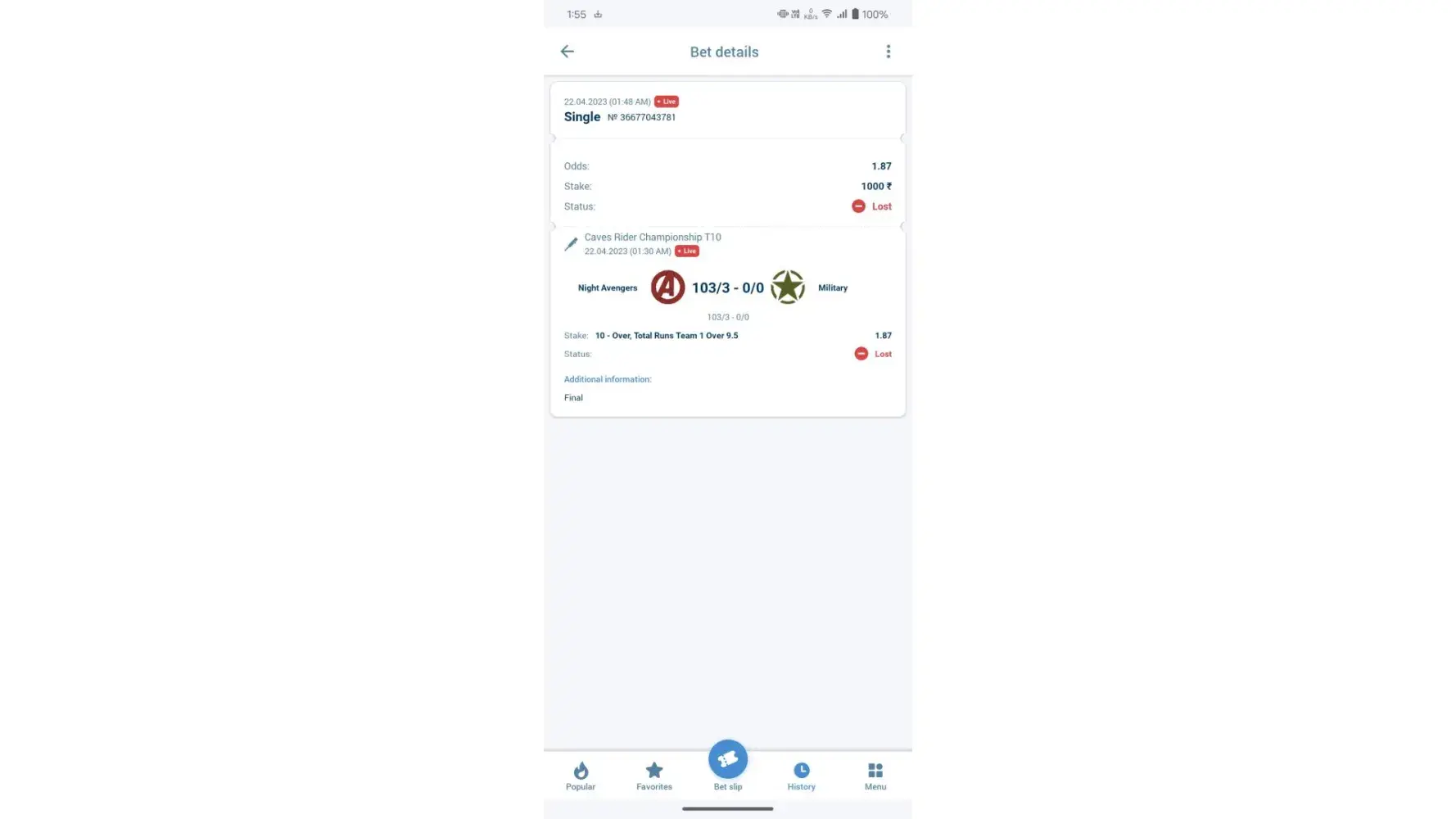 I placed a bet of 1000 in which it was that the team total score should be over the rr of 9.5 and it was above it clearly attaching the ss of the same...according to it i should've won the bet but it is showing that i lost i need my money back... it's not a small amount bet slip([protected])...My id is([protected])...please help me...