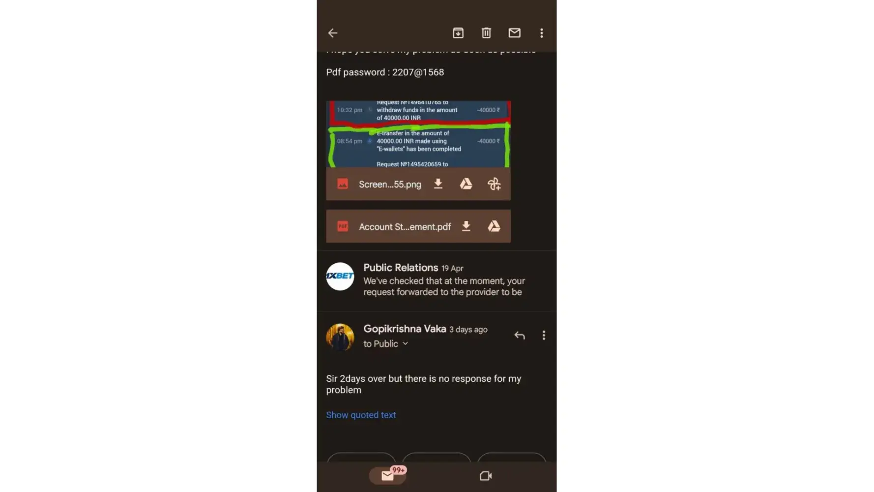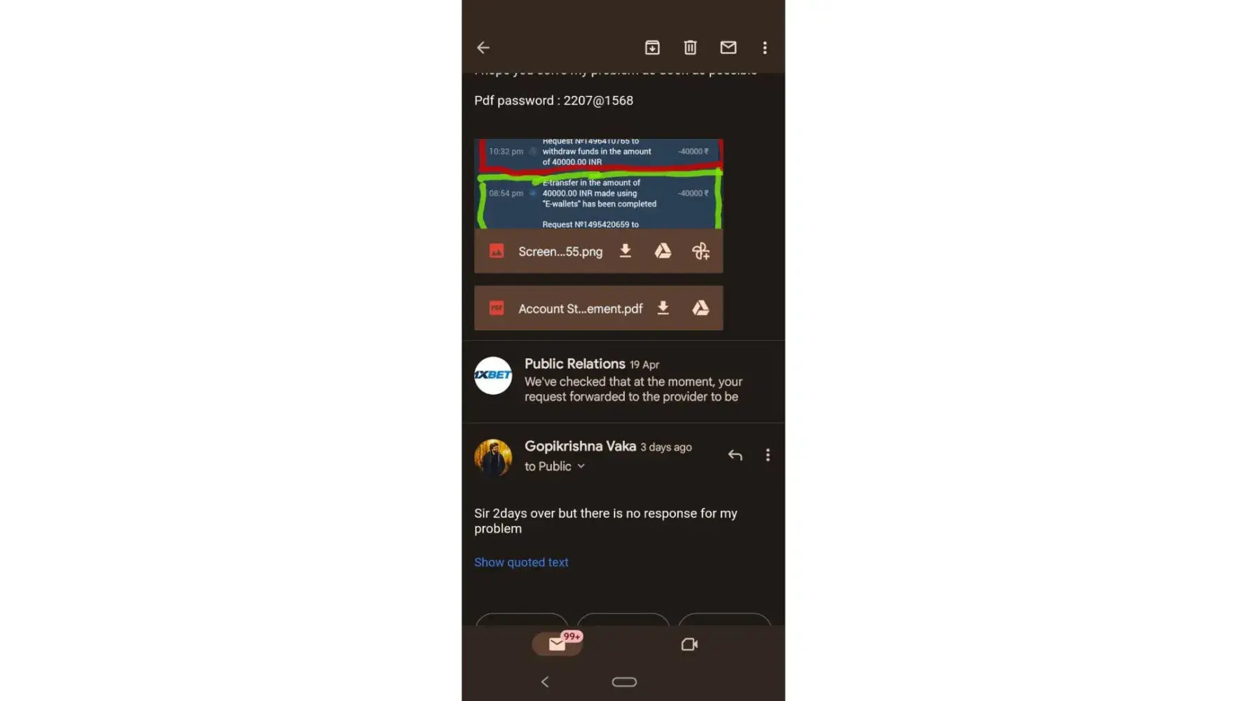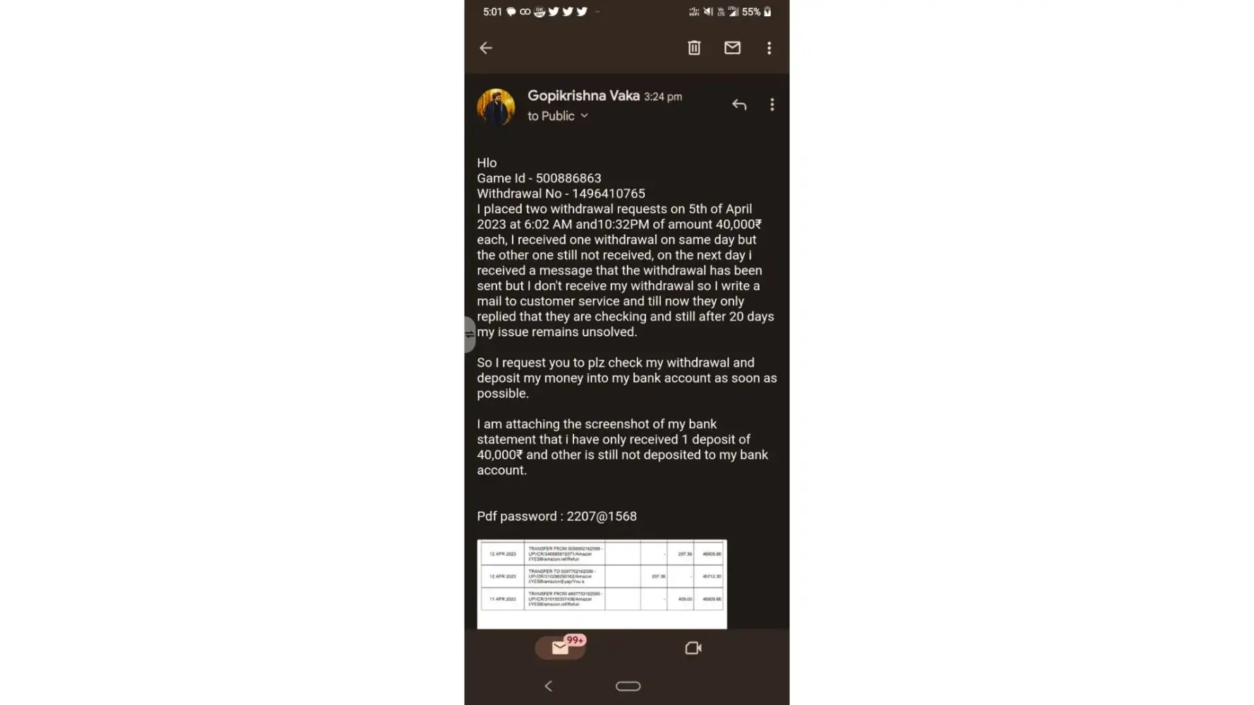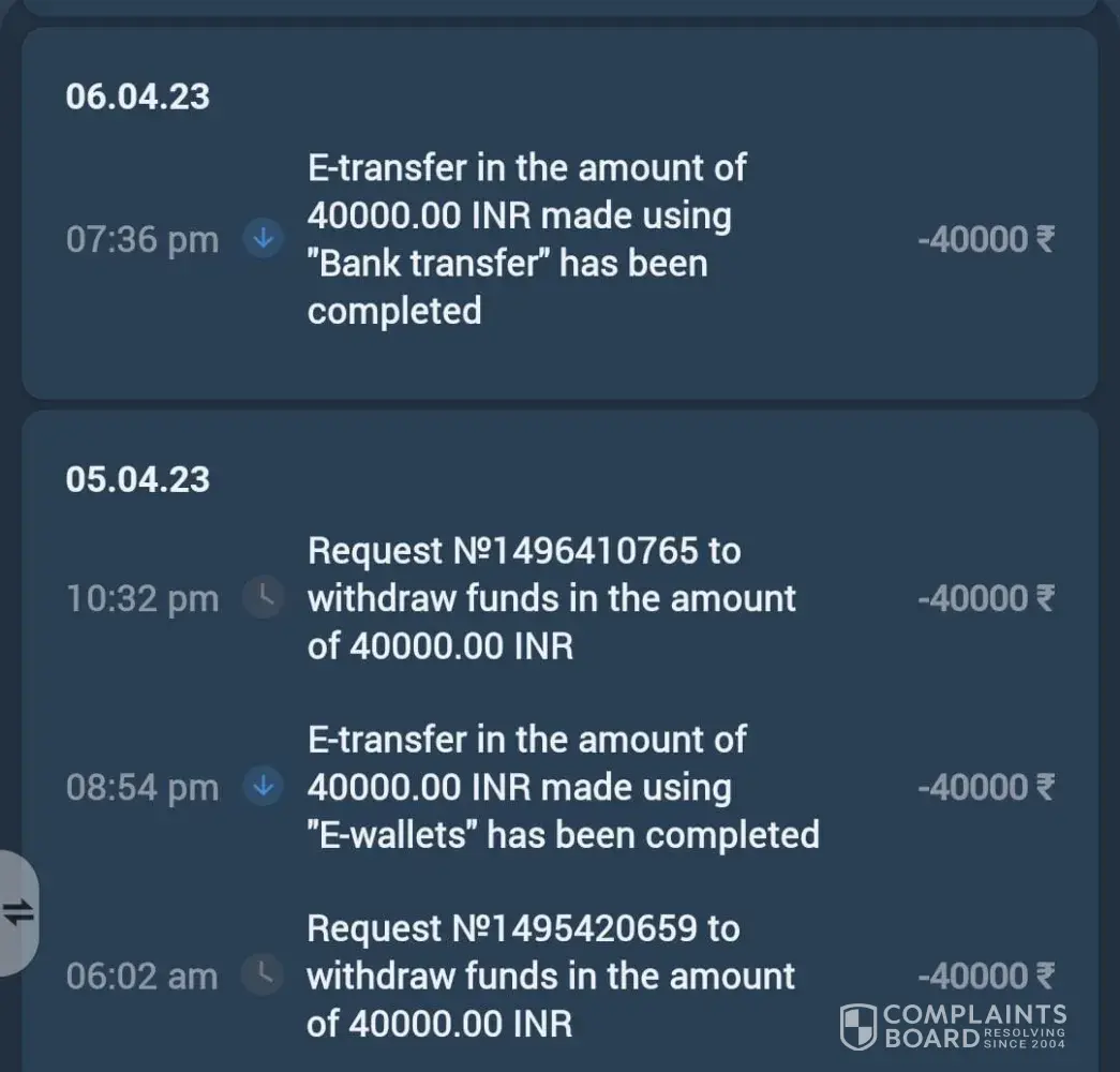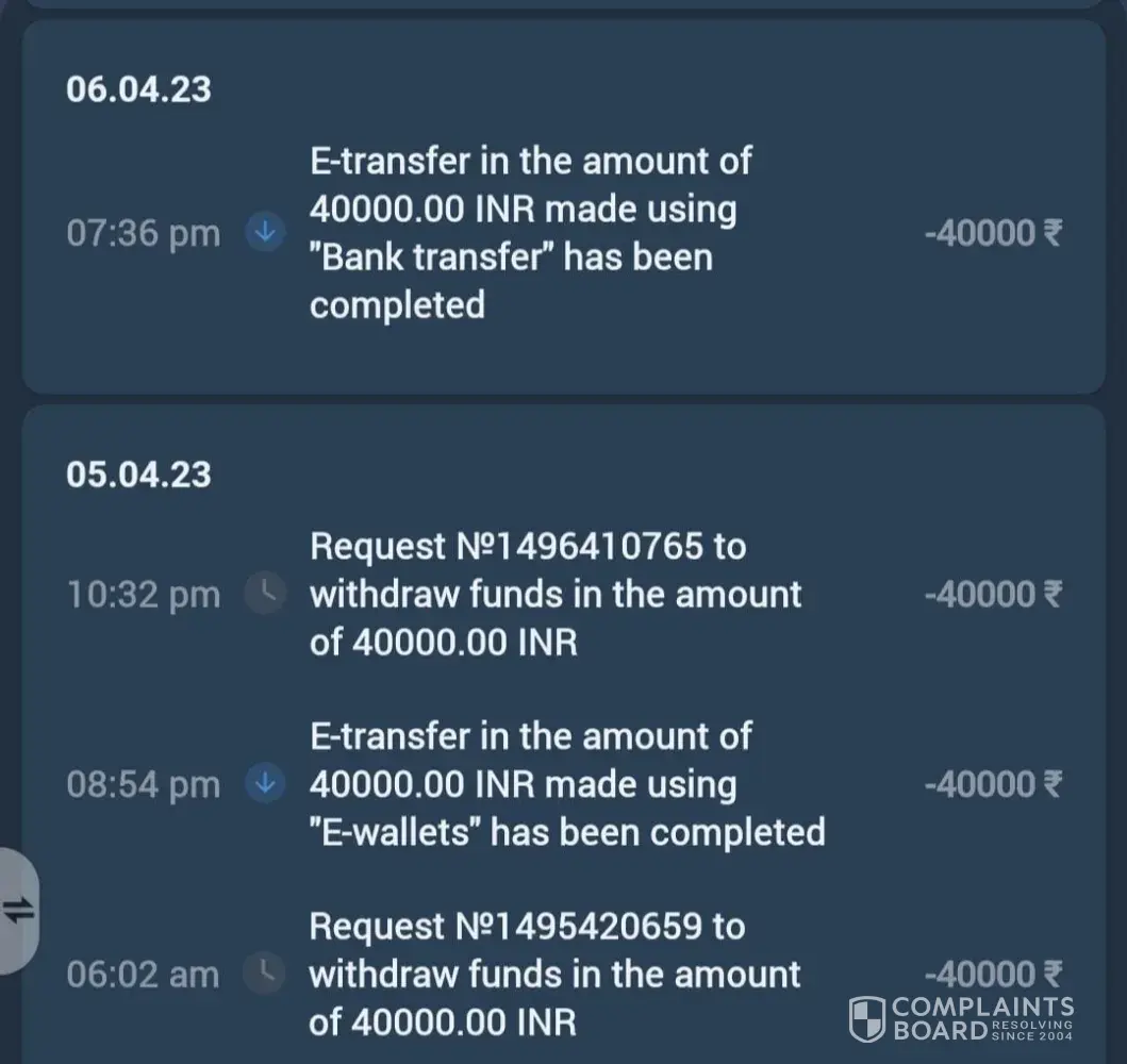 I placed two withdrawal requests on 5th of April 2023 at 6:02 AM and10:32PM of amount 40,000₹ each, I received one withdrawal on same day but the other one still not received, on the next day i received a message that the withdrawal has been sent but I don't receive my withdrawal so I write a mail to customer service and till now they only replied that they are checking and still after 20 days my issue remains unsolved.
