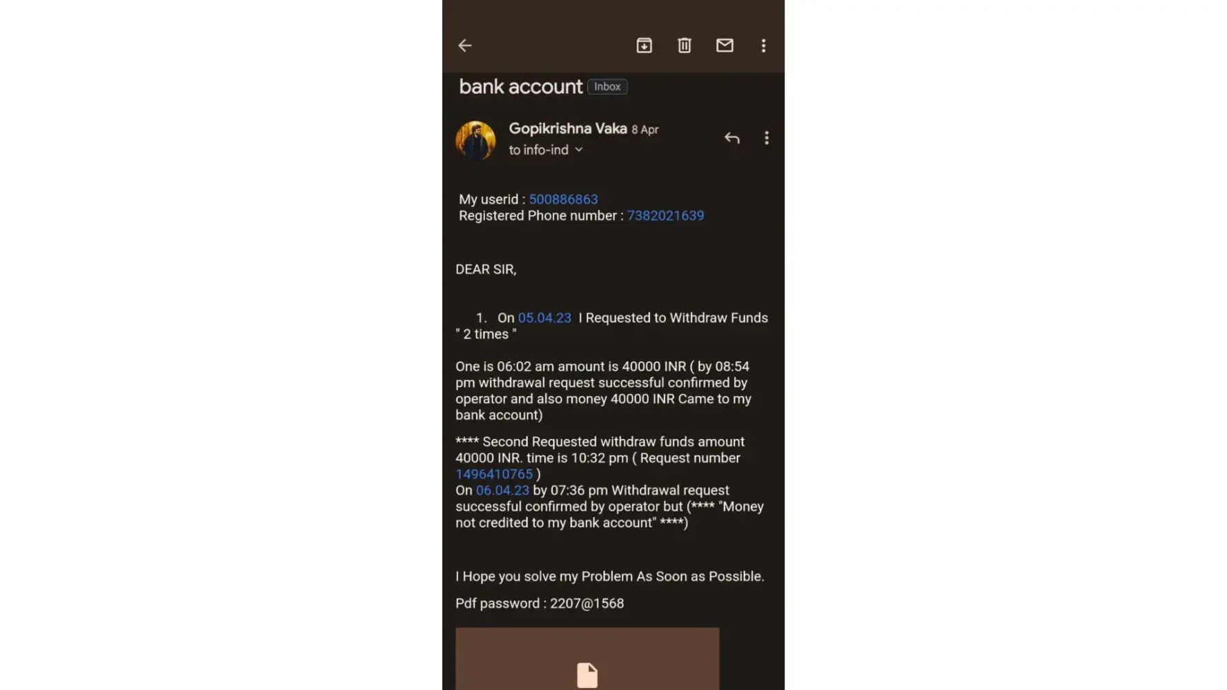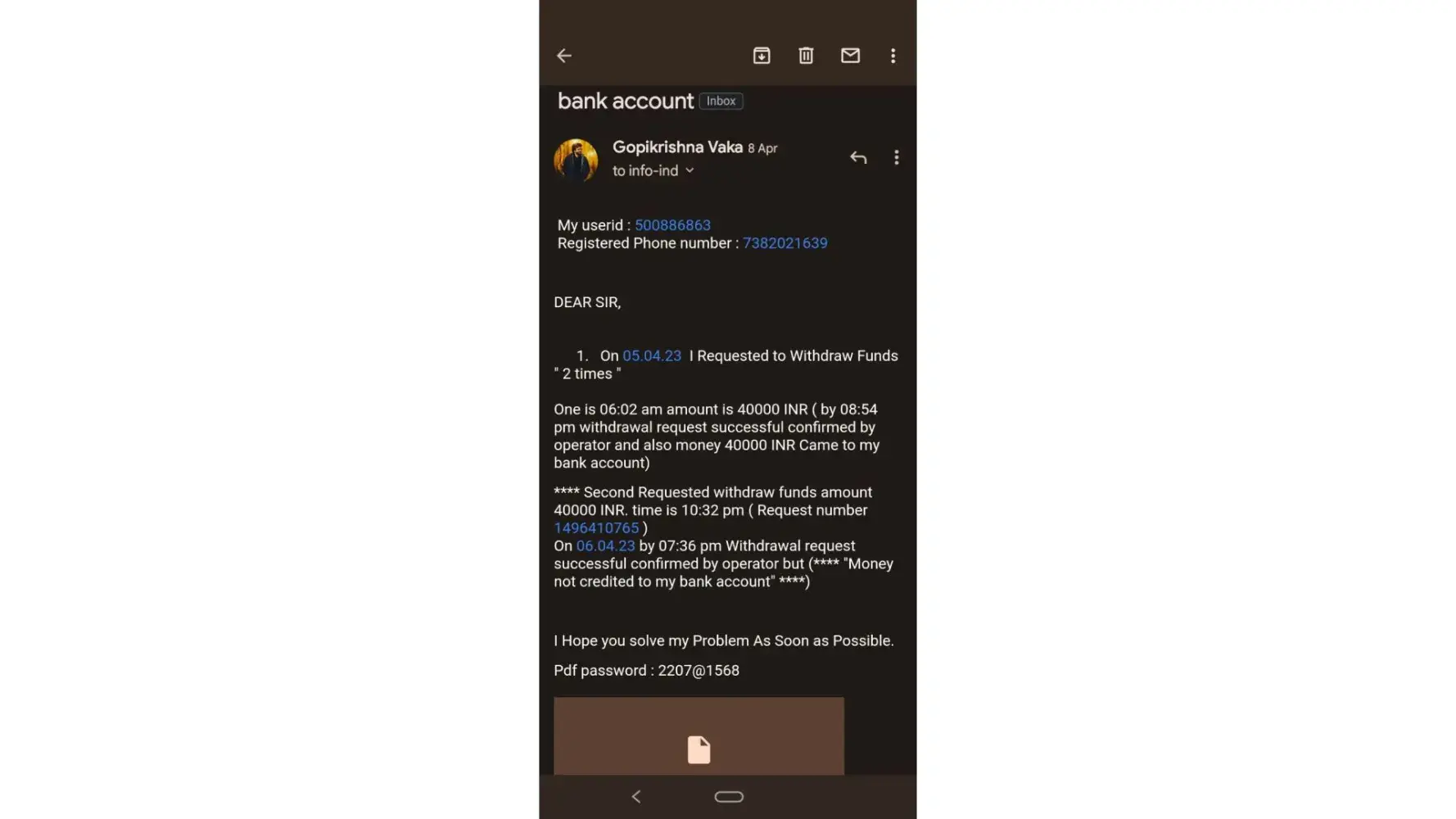 I am attaching the screenshot of my bank statement that i have only received 1 withdrawal of 40,000₹ and other withdrawal is still not received to my bank account. Id ([protected])
